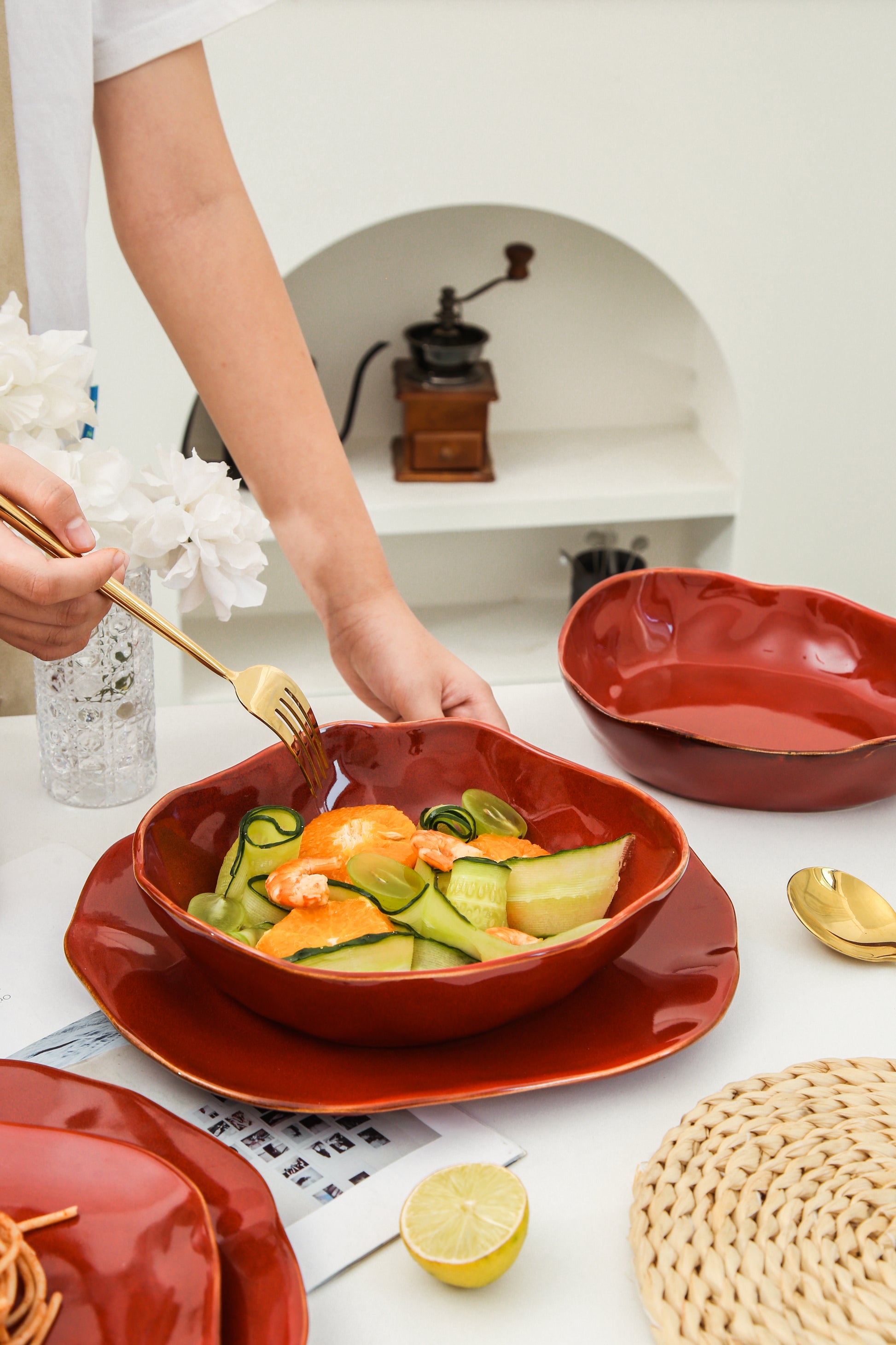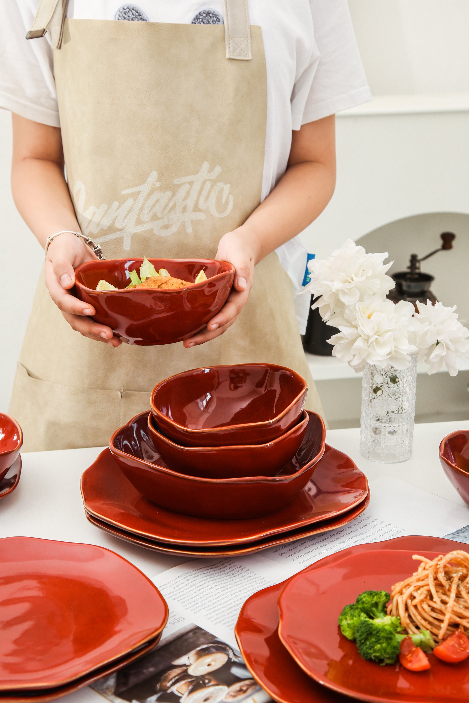 Each Decosignature dinnerware set in Garnet Rouge is crafted from premium stoneware and coated in a deep red reactive glaze that enhances natural texture. High-temperature firing ensures each piece is strong and full of personality.