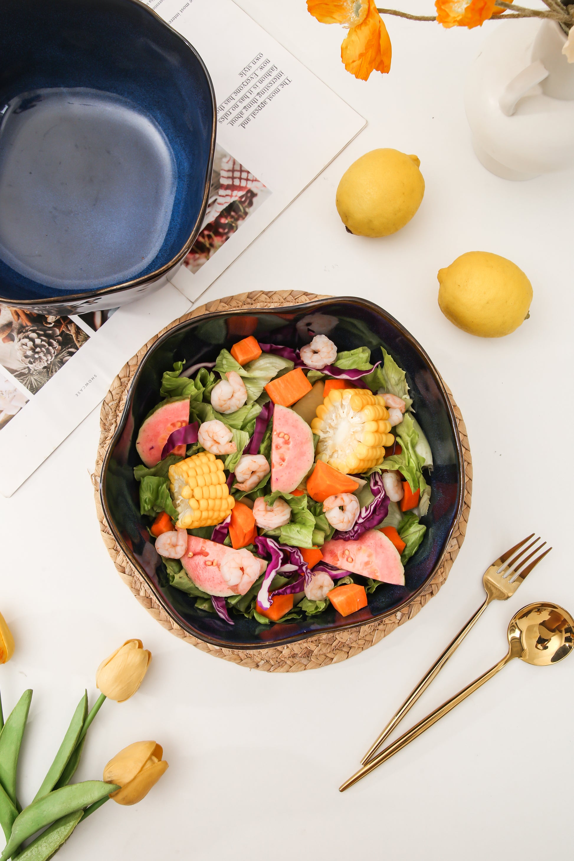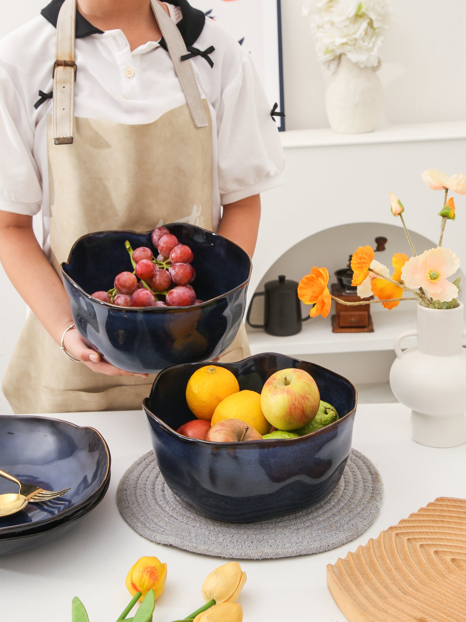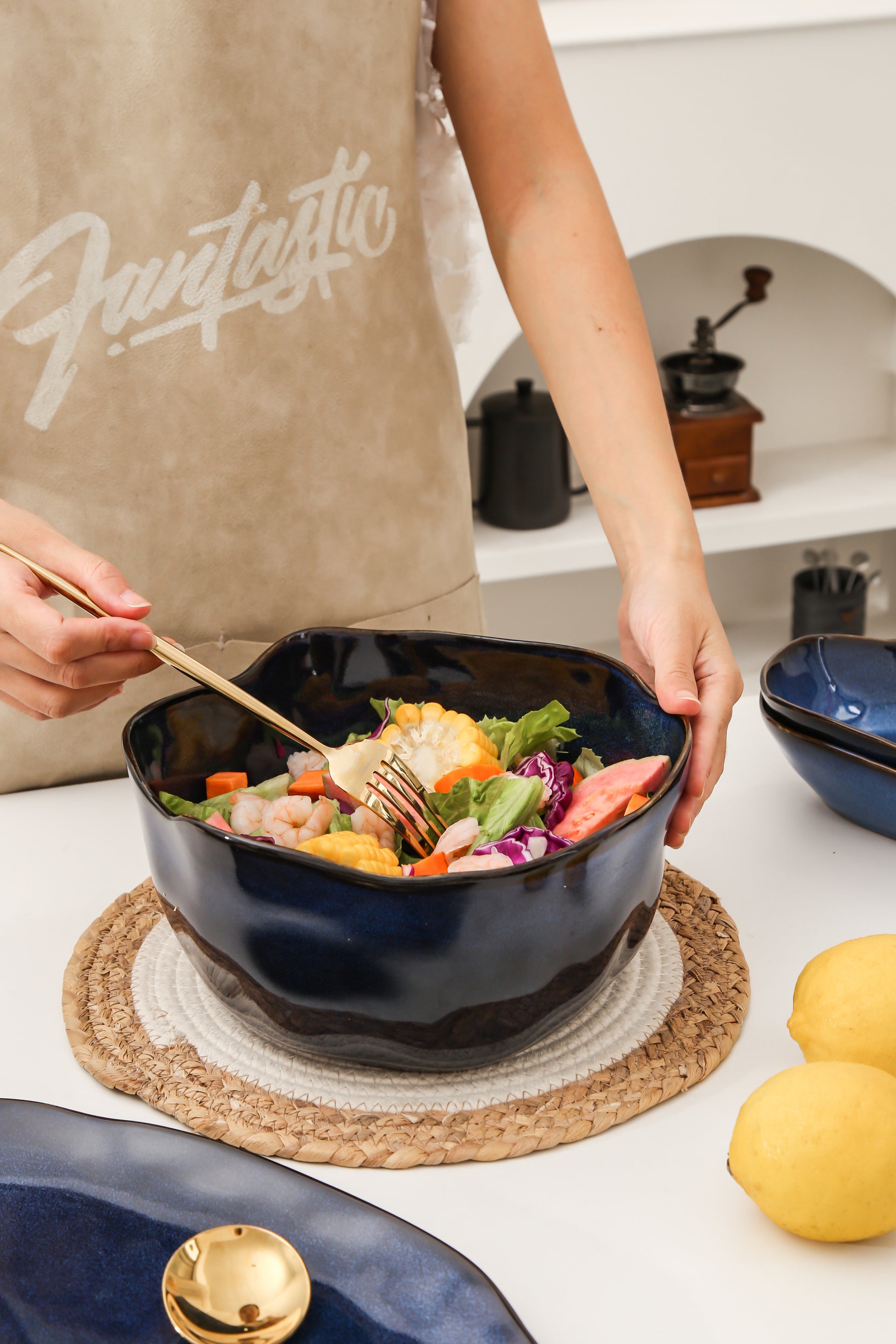 Hand-finished with a rich Ocean Blue reactive glaze, each bowl is kiln-fired for durability and unique color variation. The glazing process ensures each piece reflects natural depth and flow, highlighting the organic lines of the bowl’s silhouette.