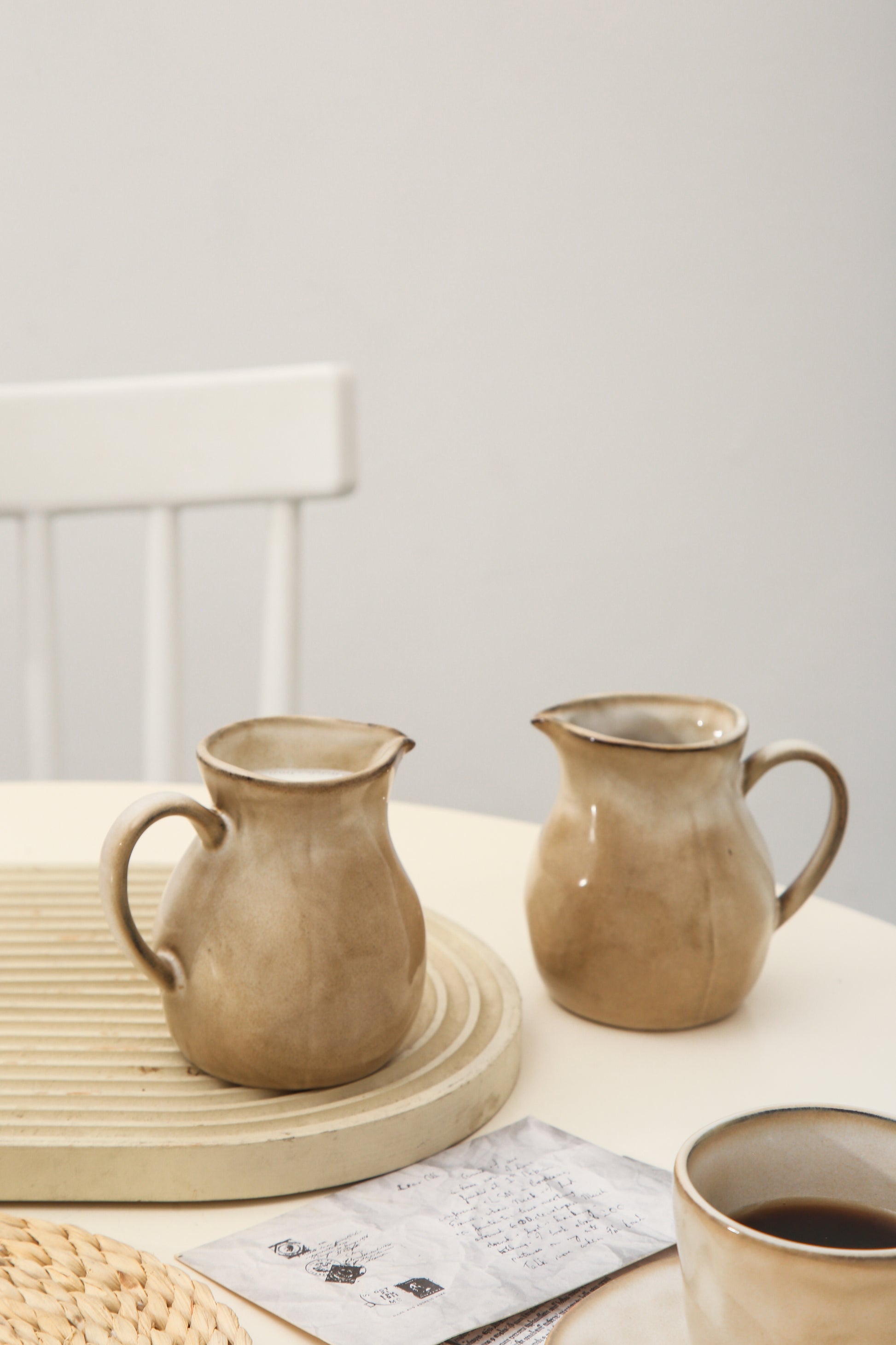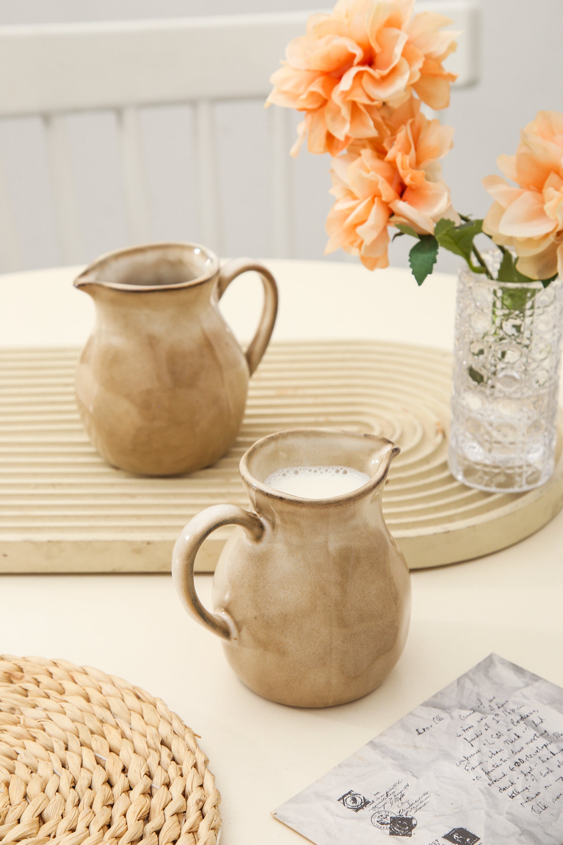 Hand-formed and finished in a warm Crema glaze, each pitcher undergoes a high-heat kiln firing for durability and depth. The glaze moves naturally along the surface, highlighting the soft, hand-sculpted lines.