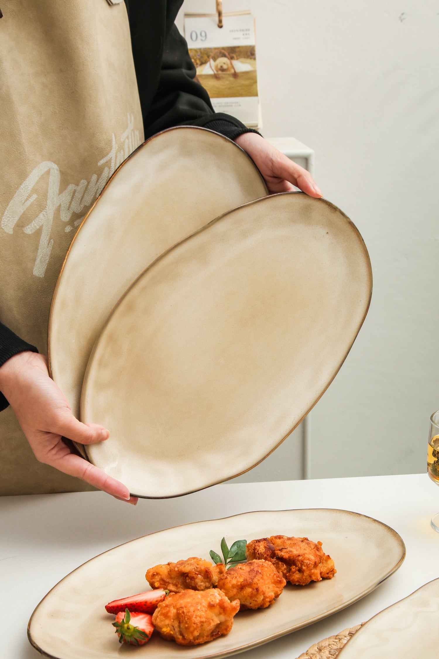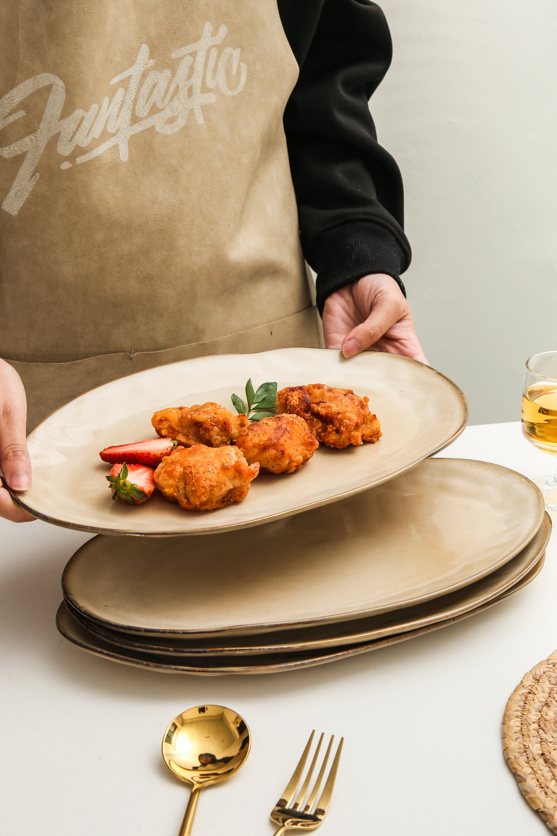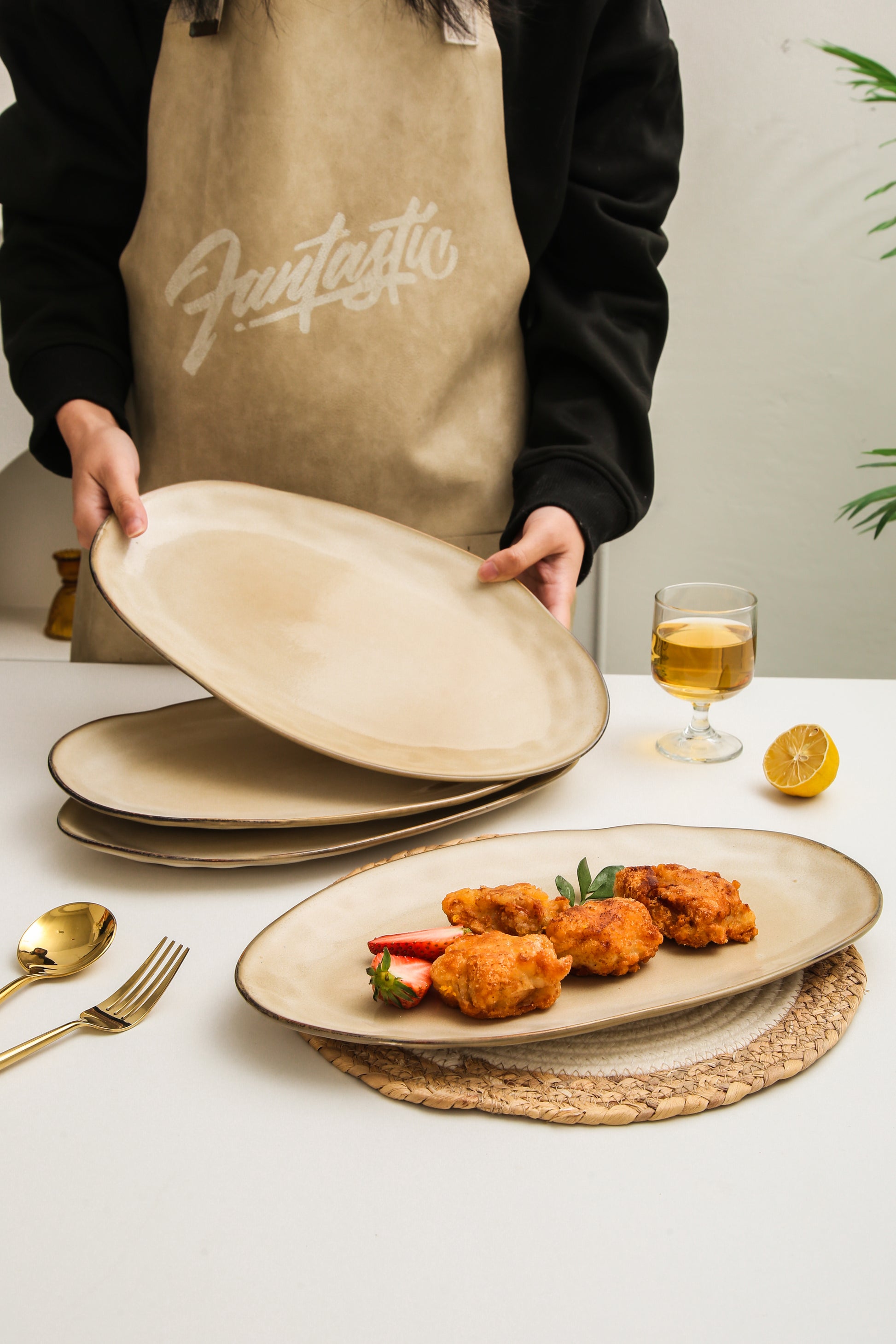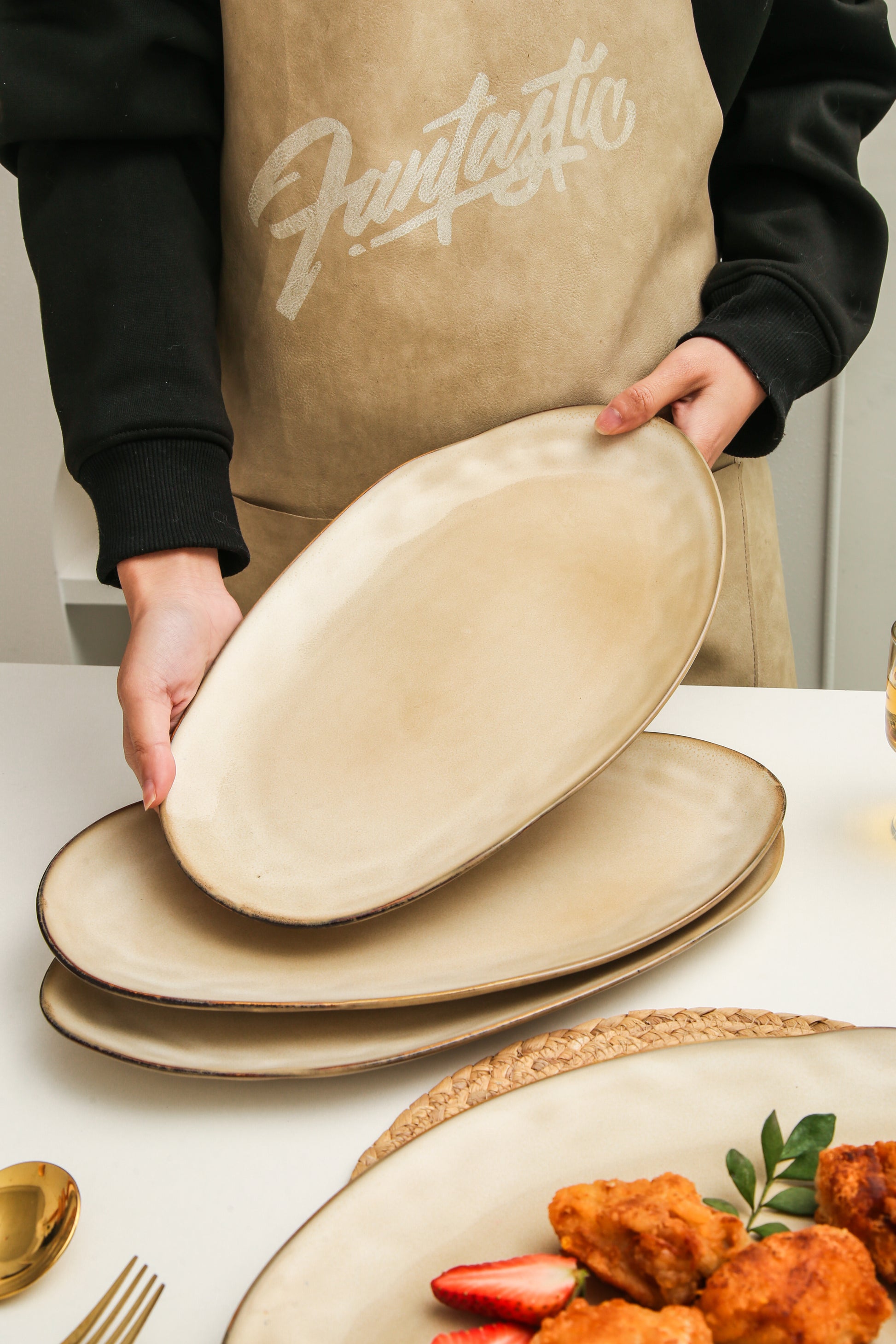 The Serving Platter Set is expertly crafted from premium stoneware clay and fired at high temperatures to ensure exceptional strength and durability. Each piece is finished with a hand-applied reactive glaze, which enhances the natural character of the clay and brings out the warmth and depth of the Crema tone.