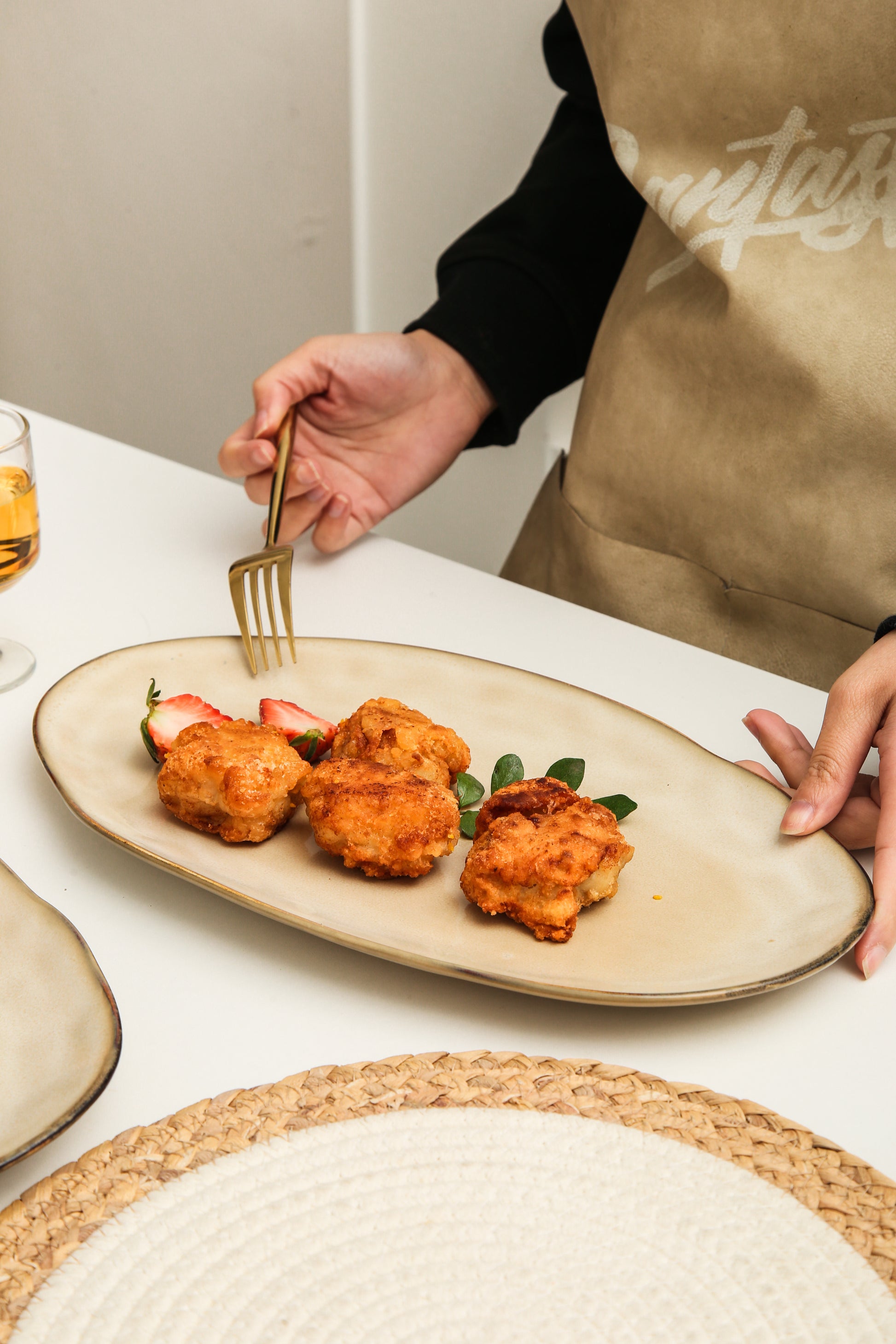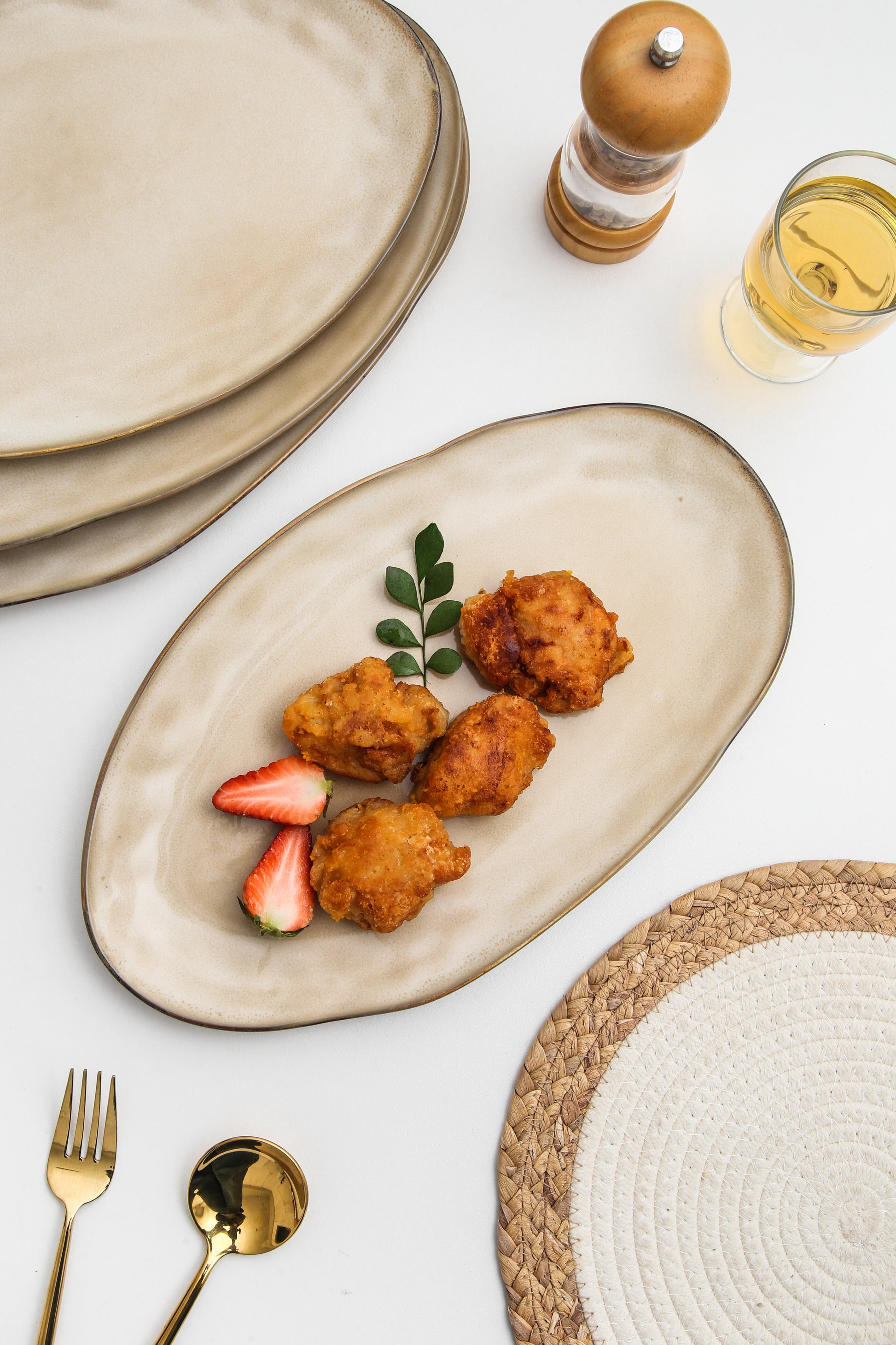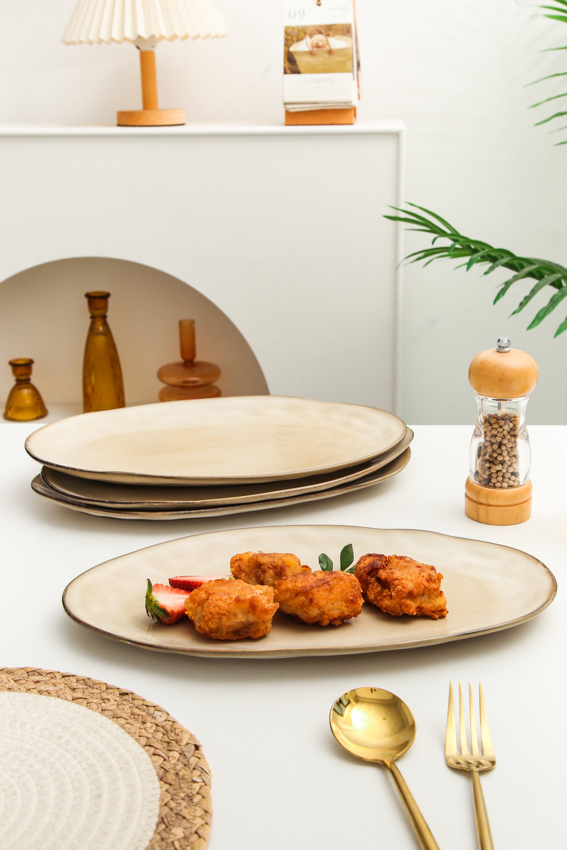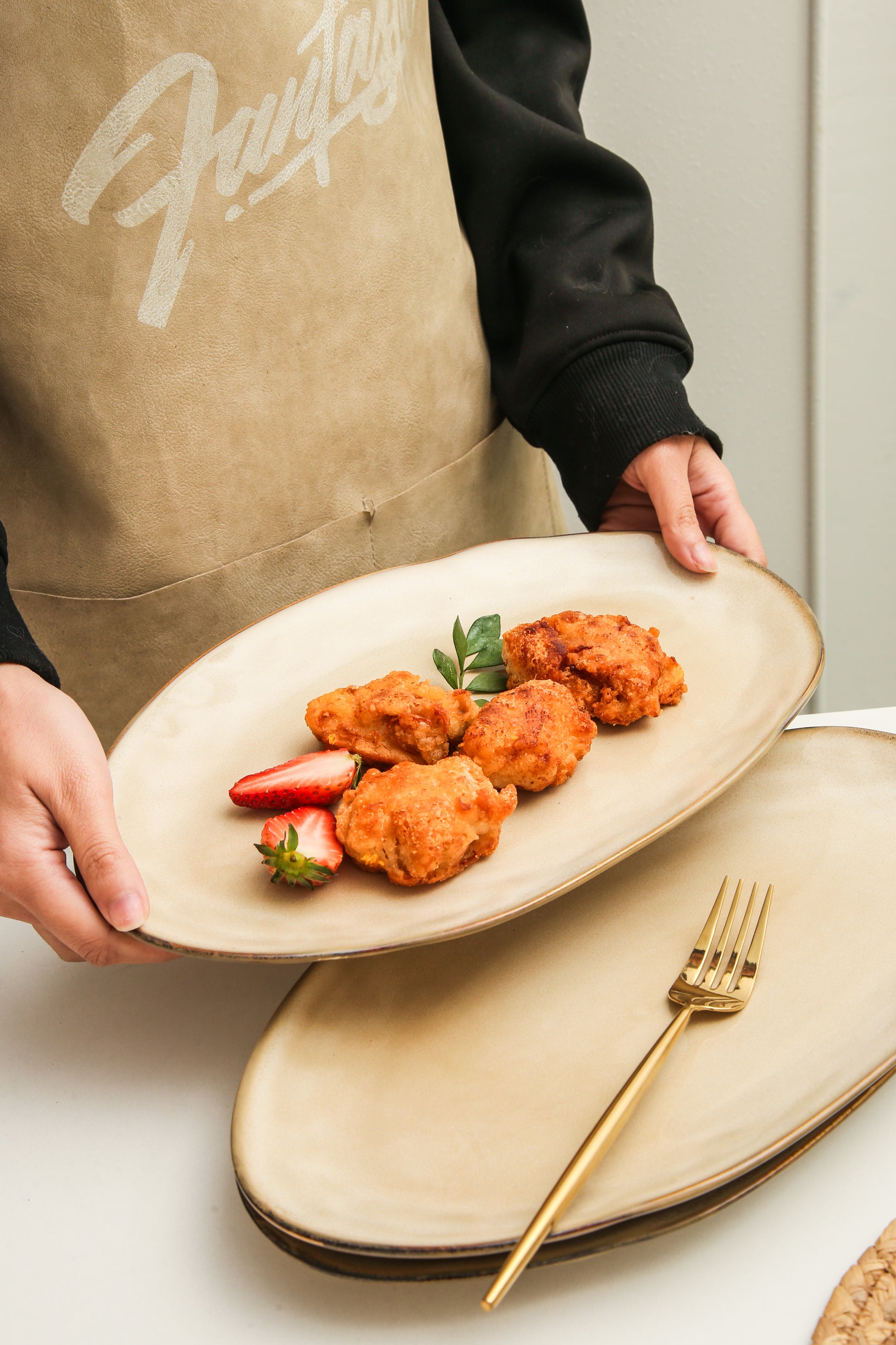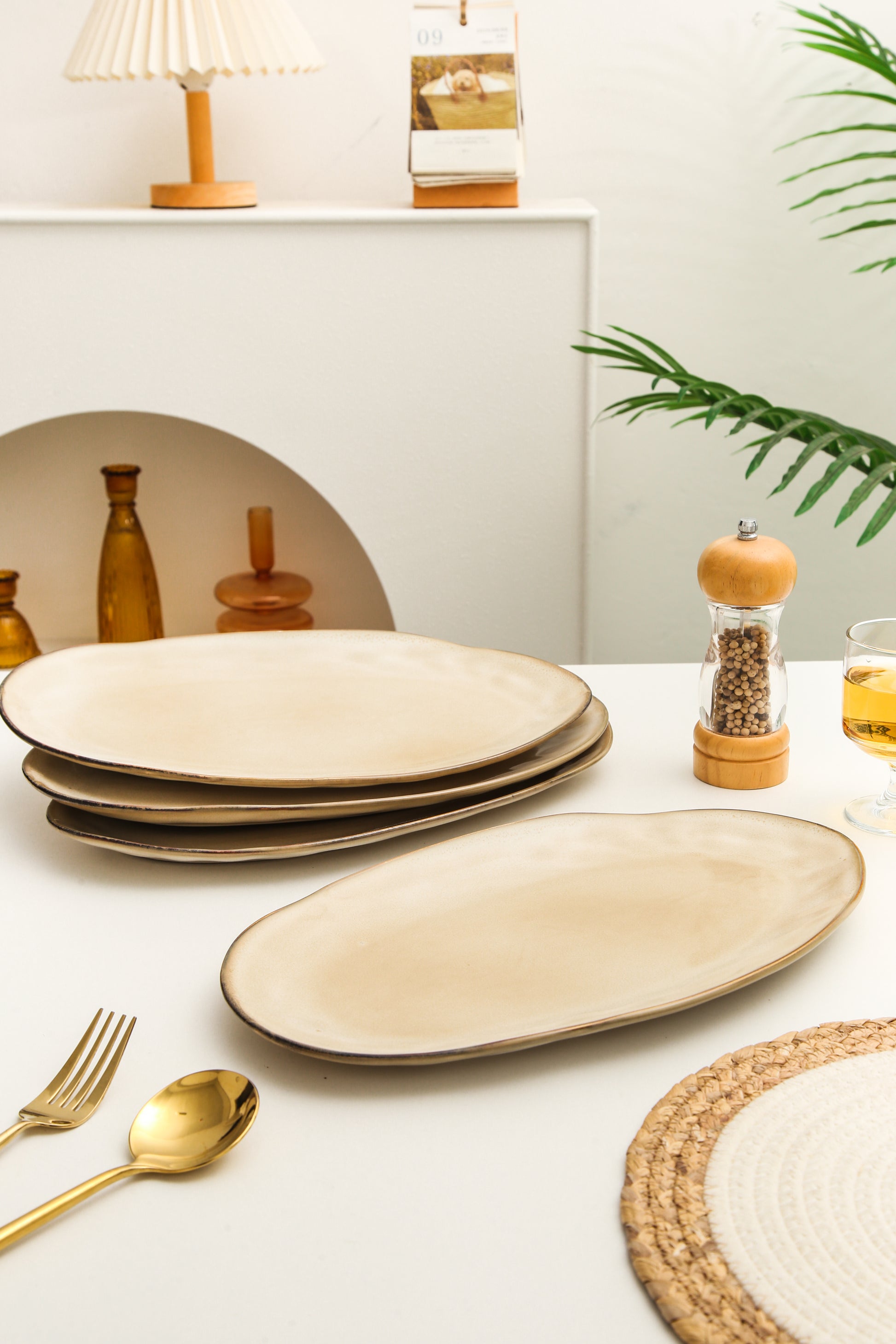 The Serving Platter Set is expertly crafted from premium stoneware clay and fired at high temperatures to ensure exceptional strength and durability. Each piece is finished with a hand-applied reactive glaze, which enhances the natural character of the clay and brings out the warmth and depth of the Crema tone.