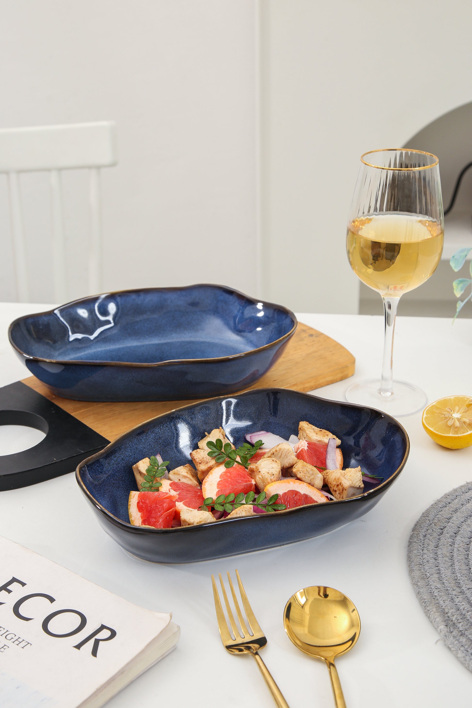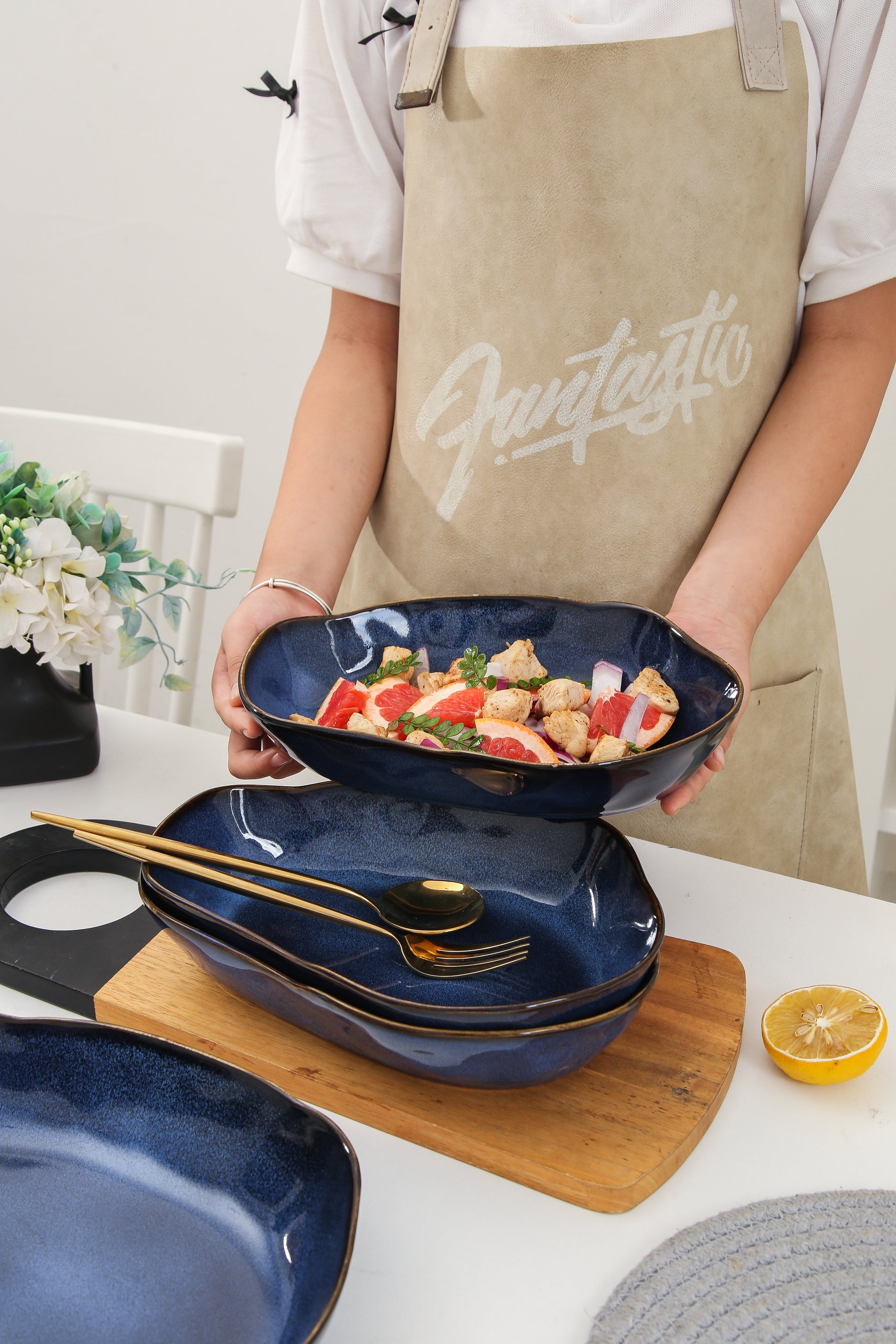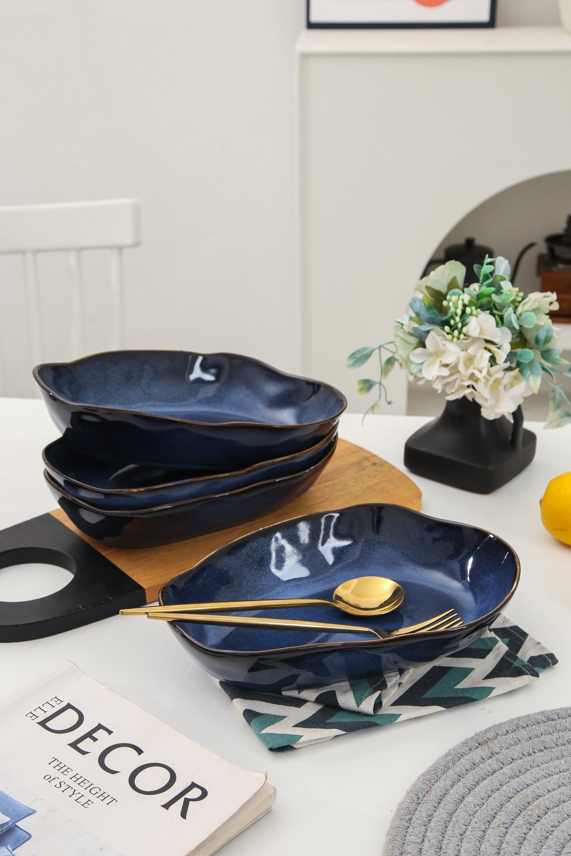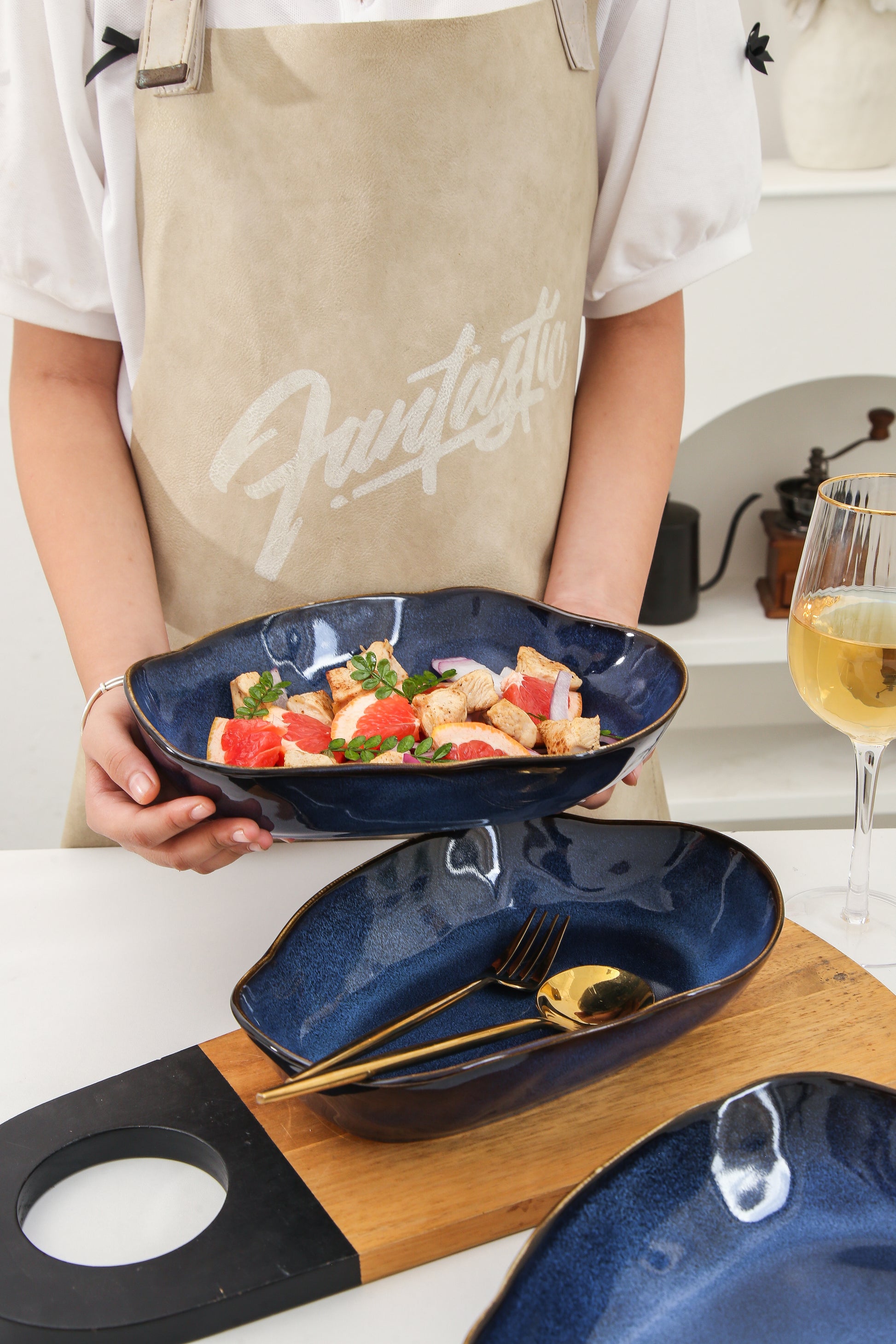 Each plate is individually crafted and kiln-fired, then coated in a reactive Ocean Blue glaze that flows naturally over the edges. This hand-finishing process ensures unique tonal depth and subtle variation, emphasizing the organic shape of every piece.