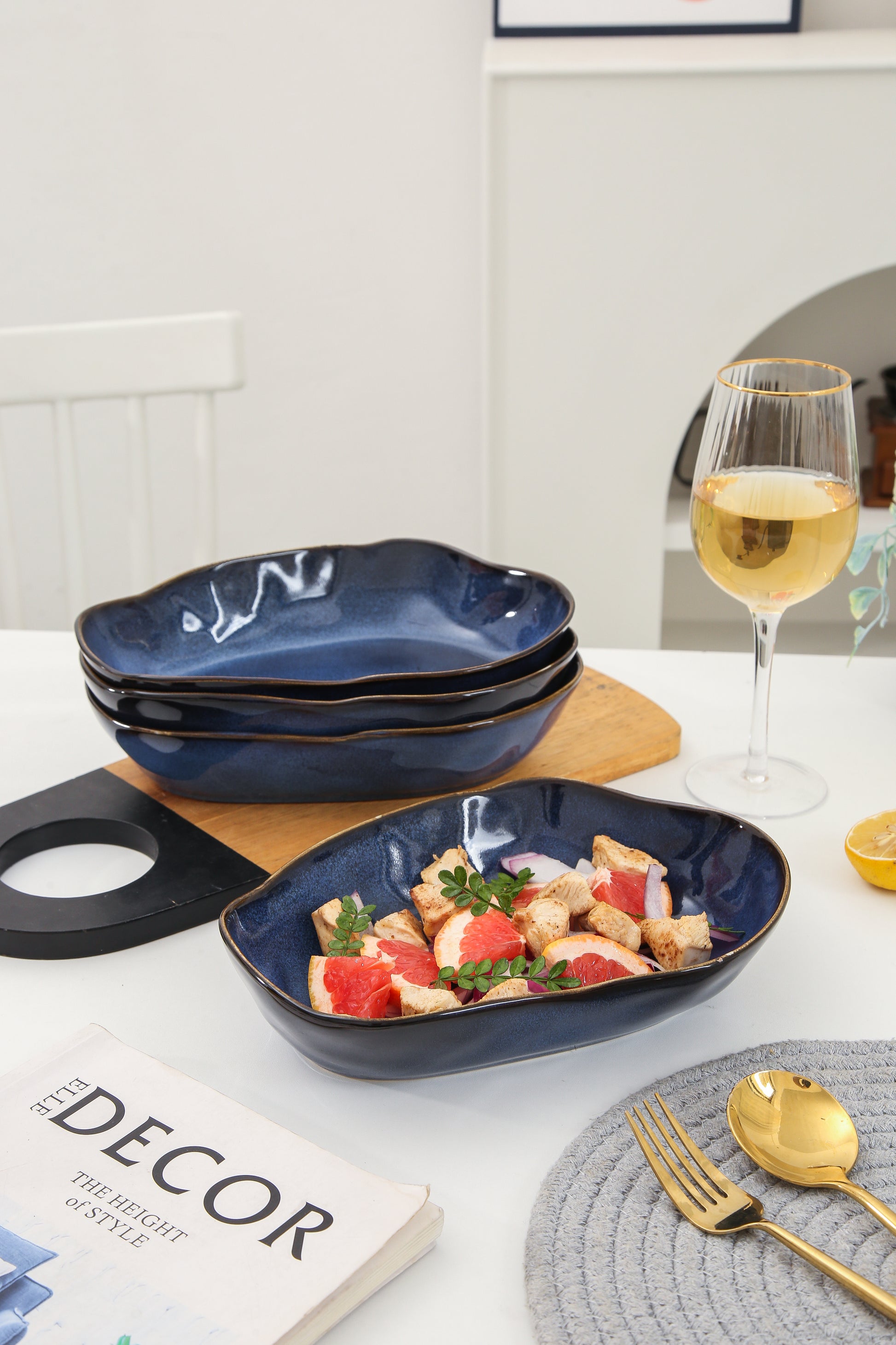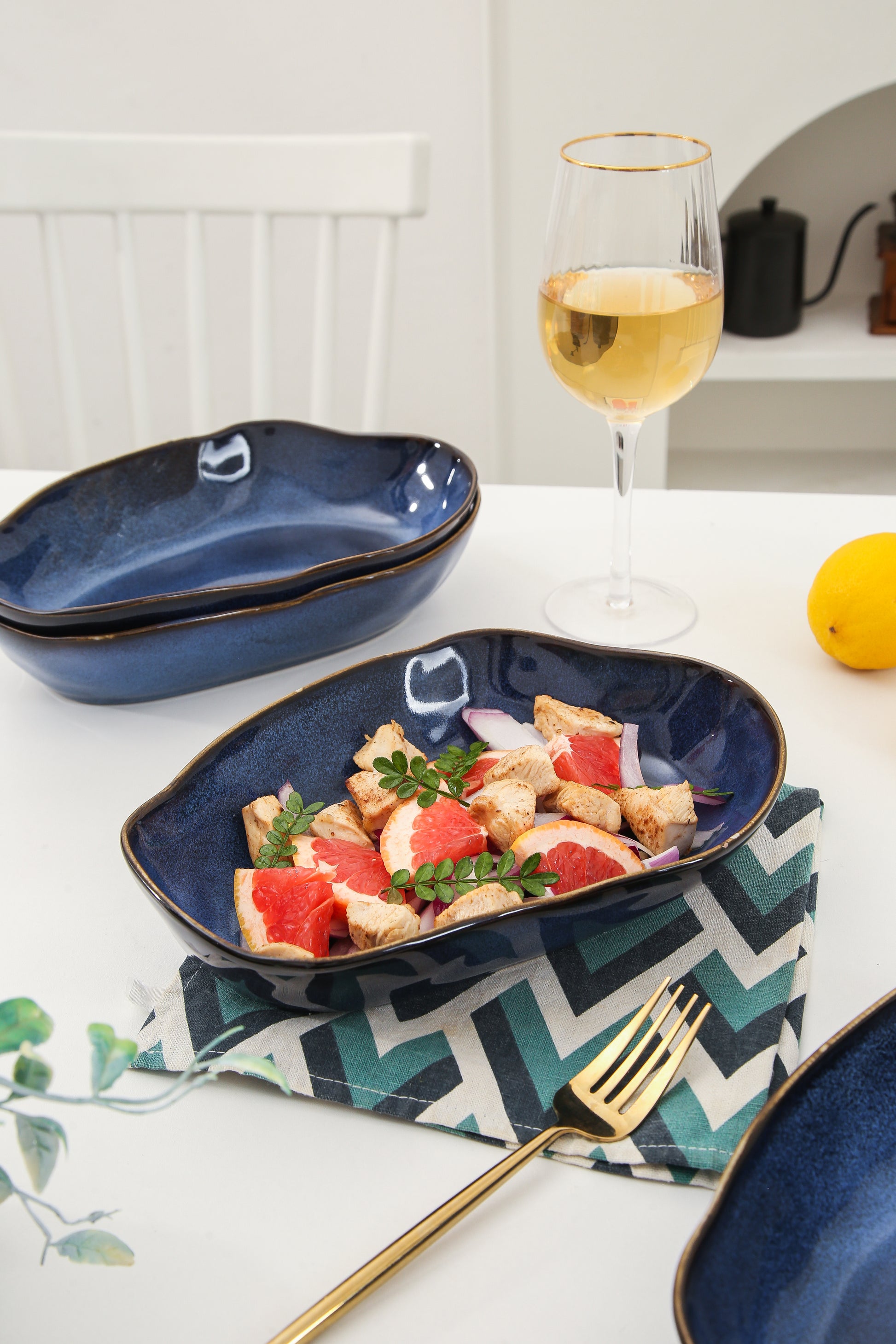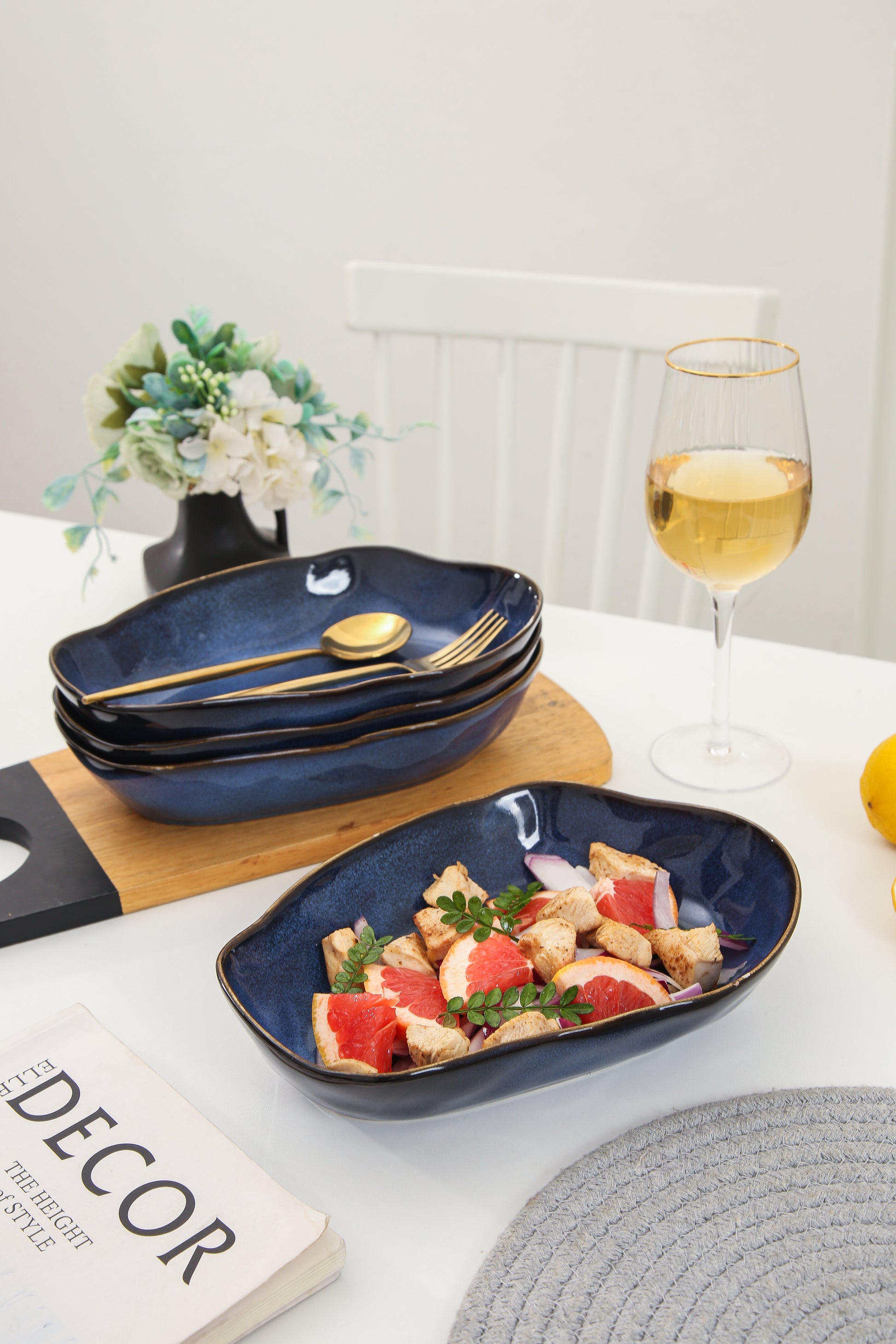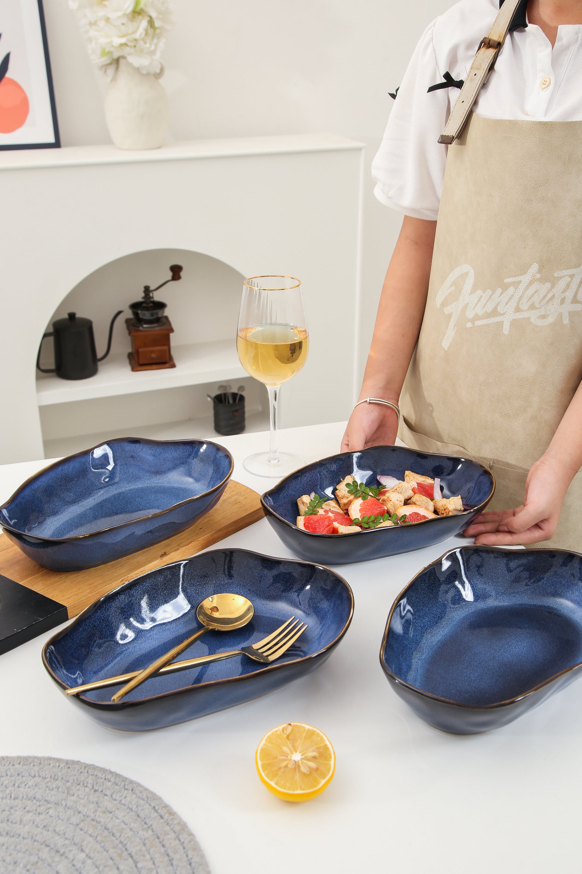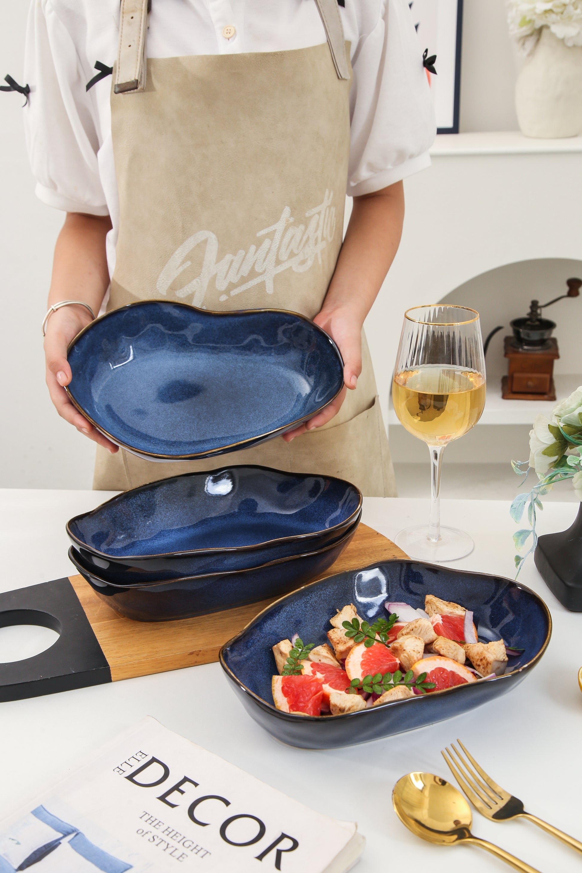 Each plate is individually crafted and kiln-fired, then coated in a reactive Ocean Blue glaze that flows naturally over the edges. This hand-finishing process ensures unique tonal depth and subtle variation, emphasizing the organic shape of every piece.