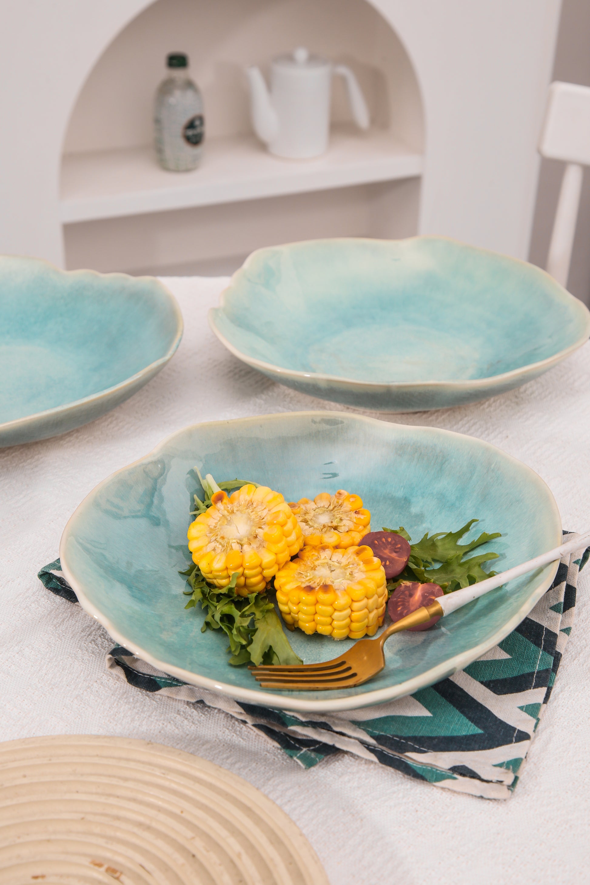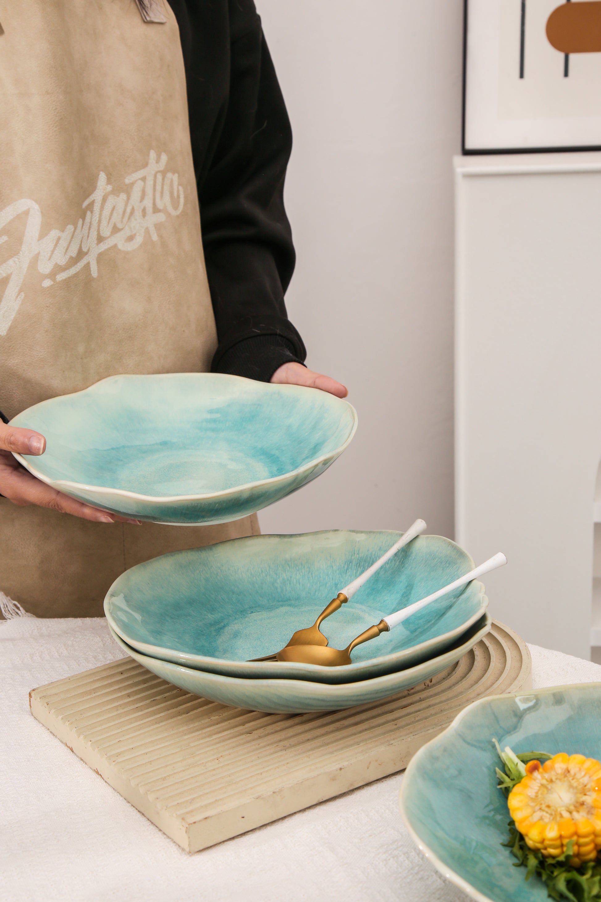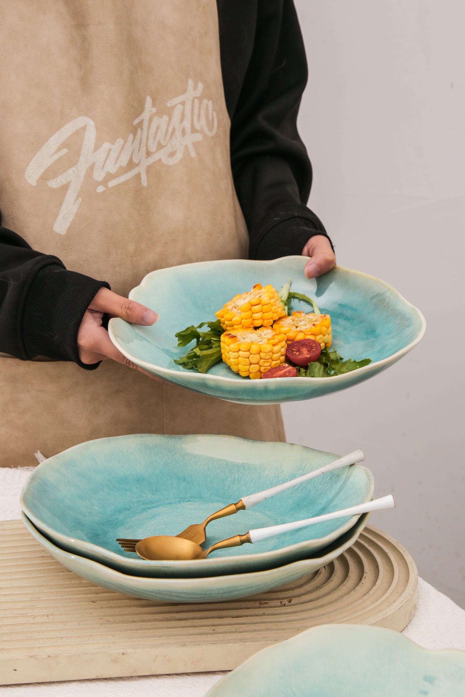 The Aqua Blue deep plates are defined by their fluid profile and gentle asymmetry. Their shape feels natural in the hand and looks striking on the table. The glaze reflects light with soft, shifting tones—reminding you of water, sky, and stillness. Built to resist daily wear, these pieces combine utility with the unmistakable beauty of the Organic Collection.