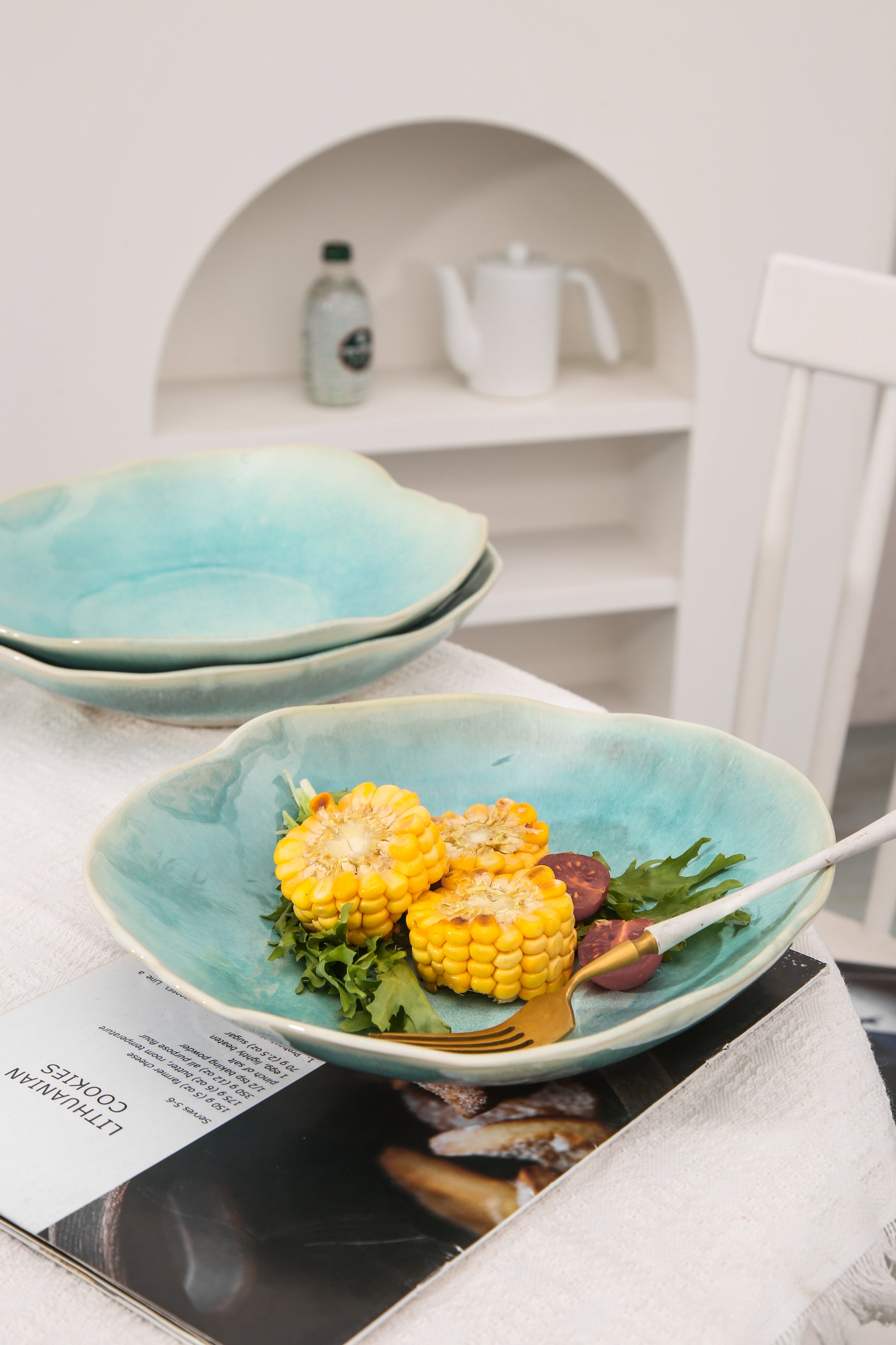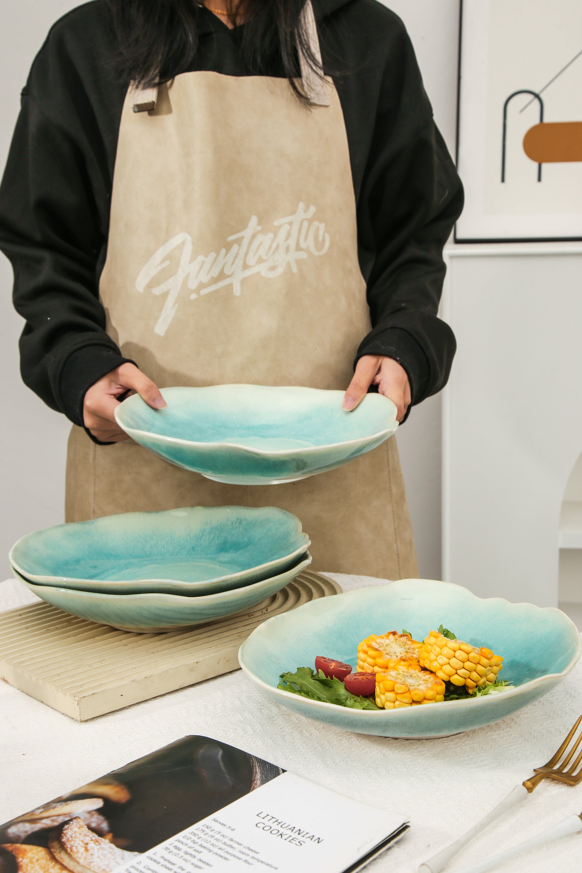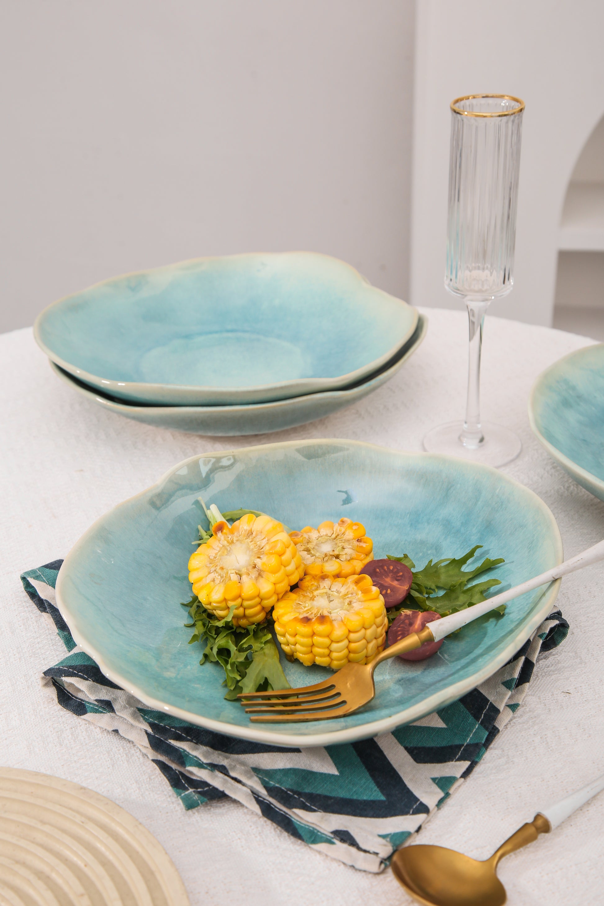 The Aqua Blue deep plates are defined by their fluid profile and gentle asymmetry. Their shape feels natural in the hand and looks striking on the table. The glaze reflects light with soft, shifting tones—reminding you of water, sky, and stillness. Built to resist daily wear, these pieces combine utility with the unmistakable beauty of the Organic Collection.