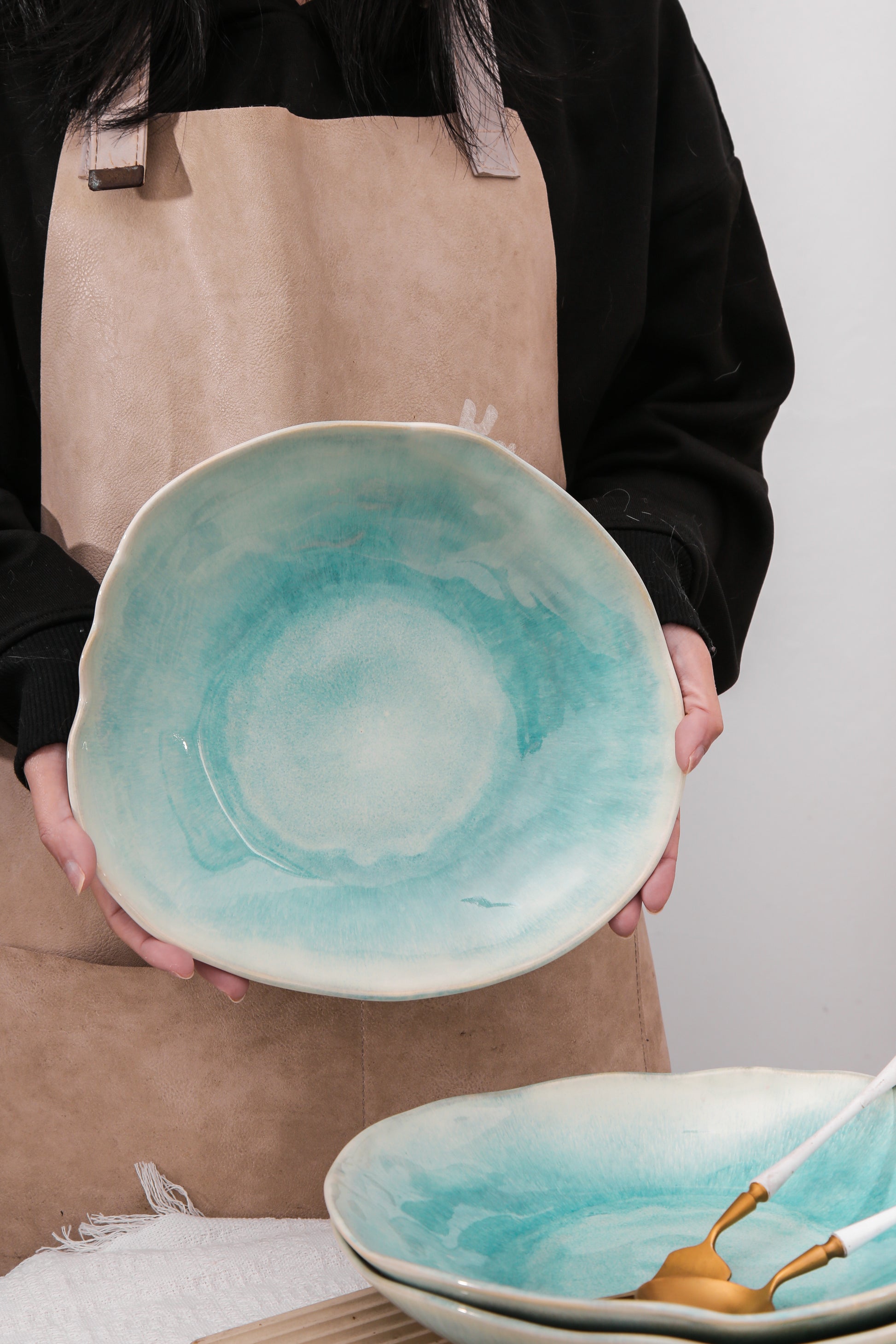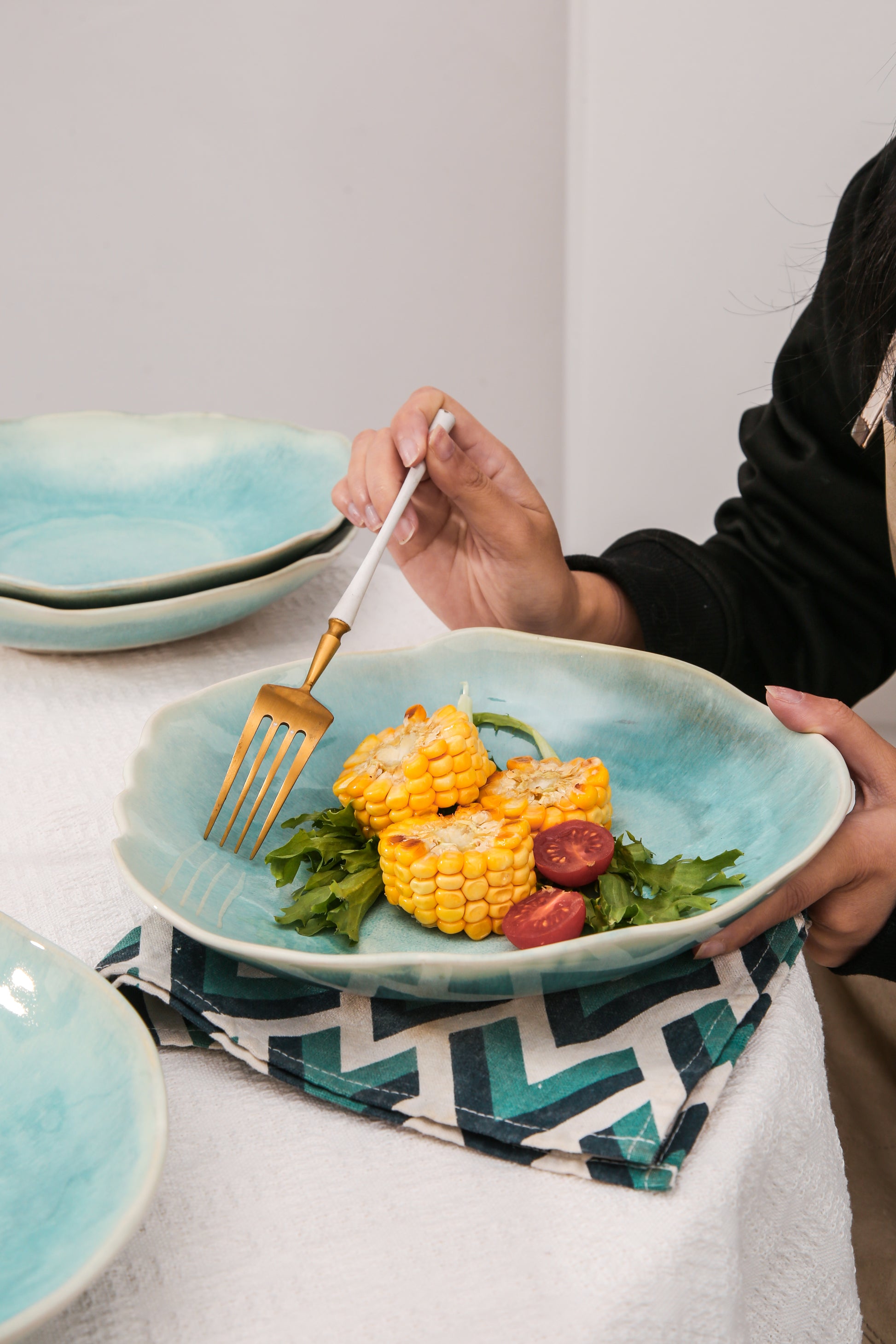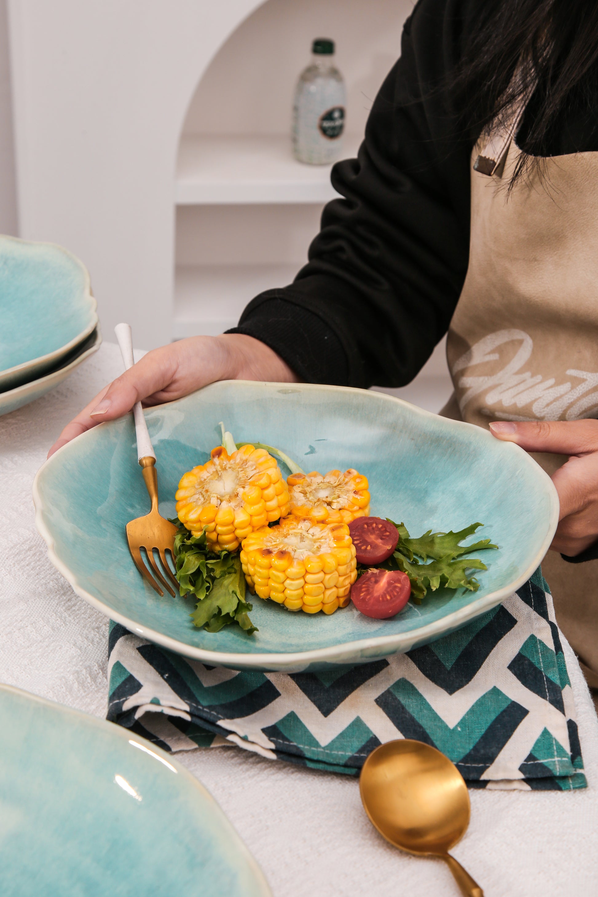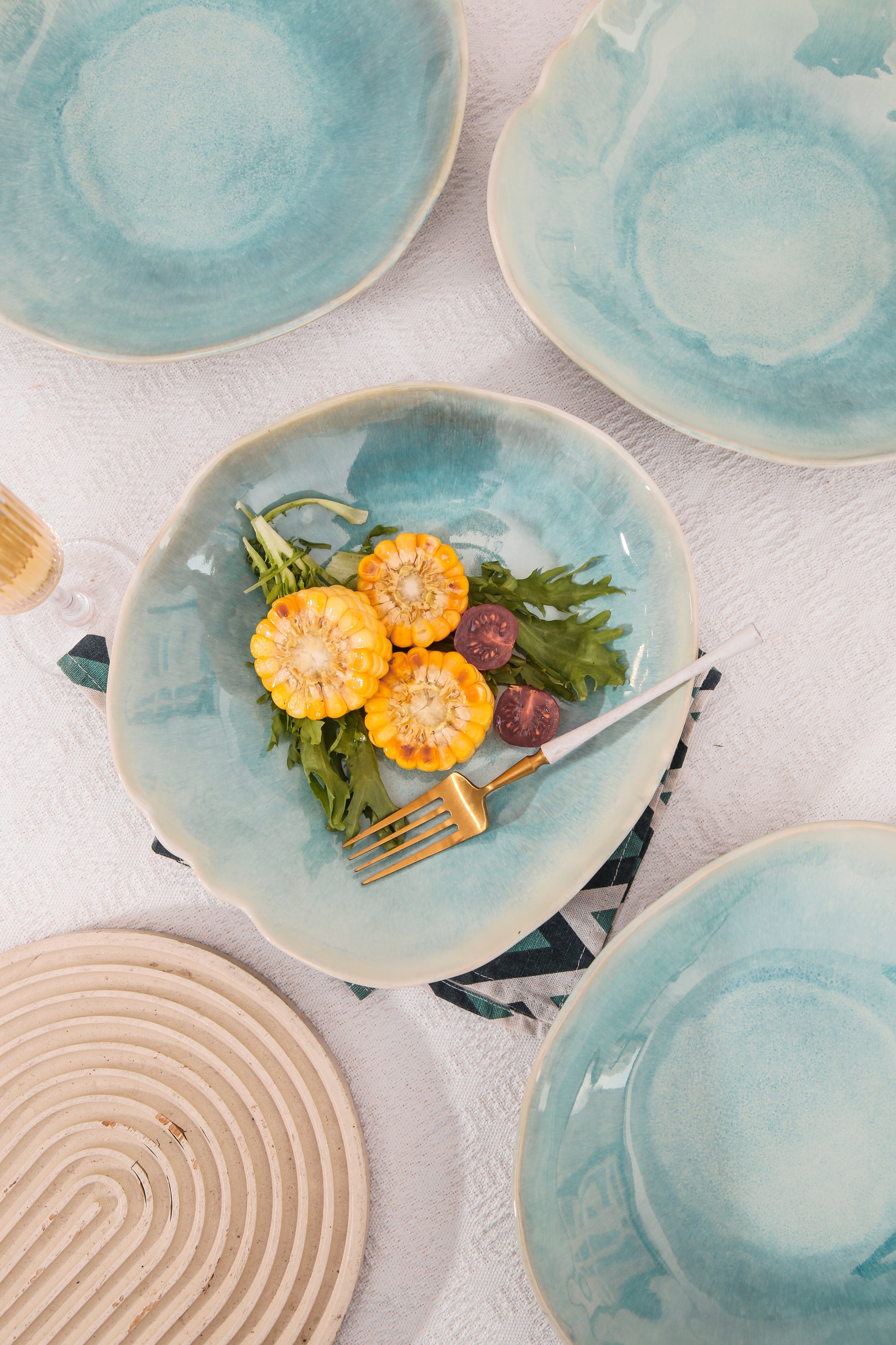 Each plate is shaped using natural motion, following the clay’s own curves rather than imposing symmetry. After firing at high temperatures to ensure strength, the Aqua Blue glaze is brushed and poured by hand, allowing it to settle differently on each piece. This method creates the soft waves of blue that make every plate feel alive and individual.
