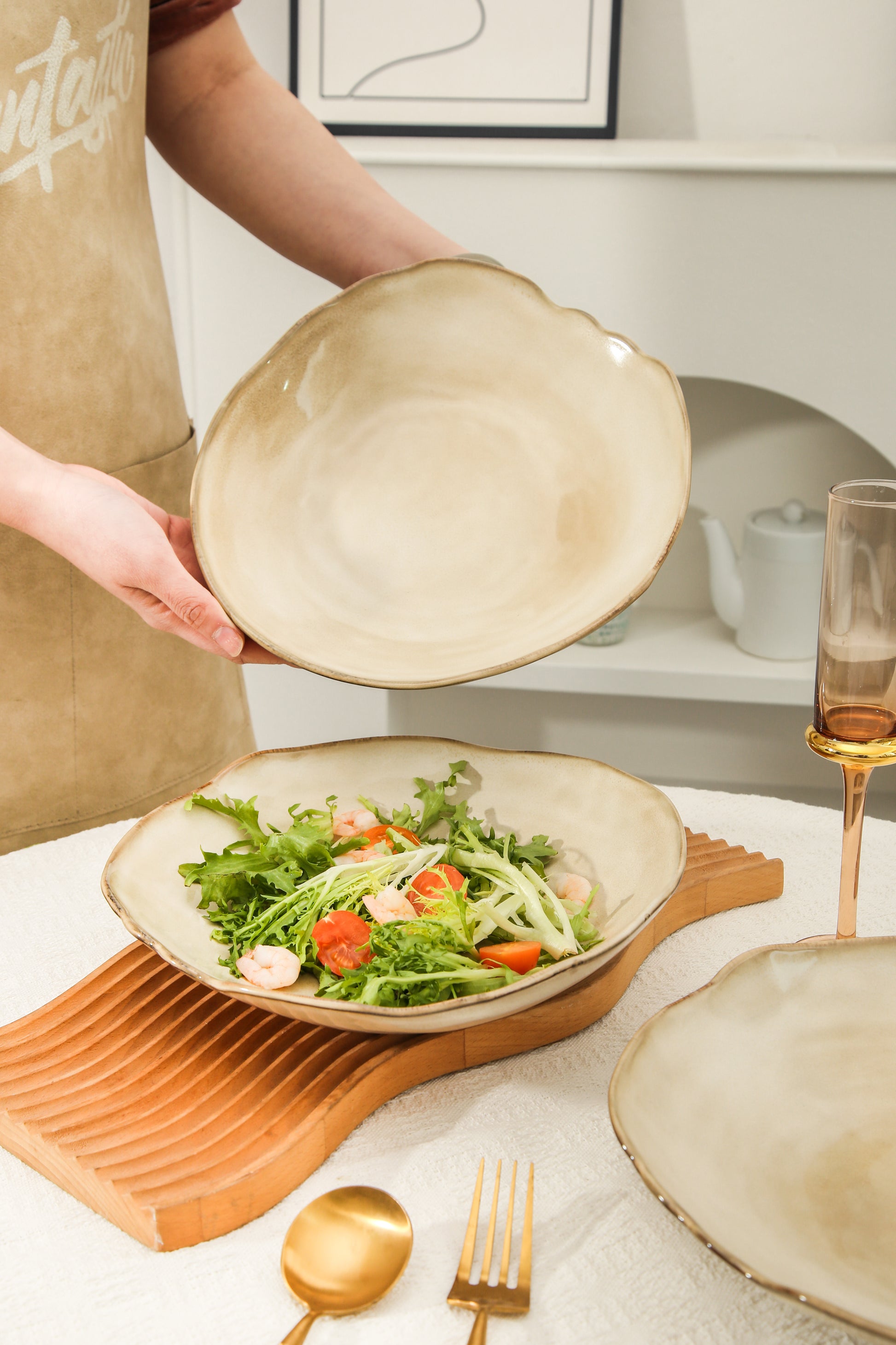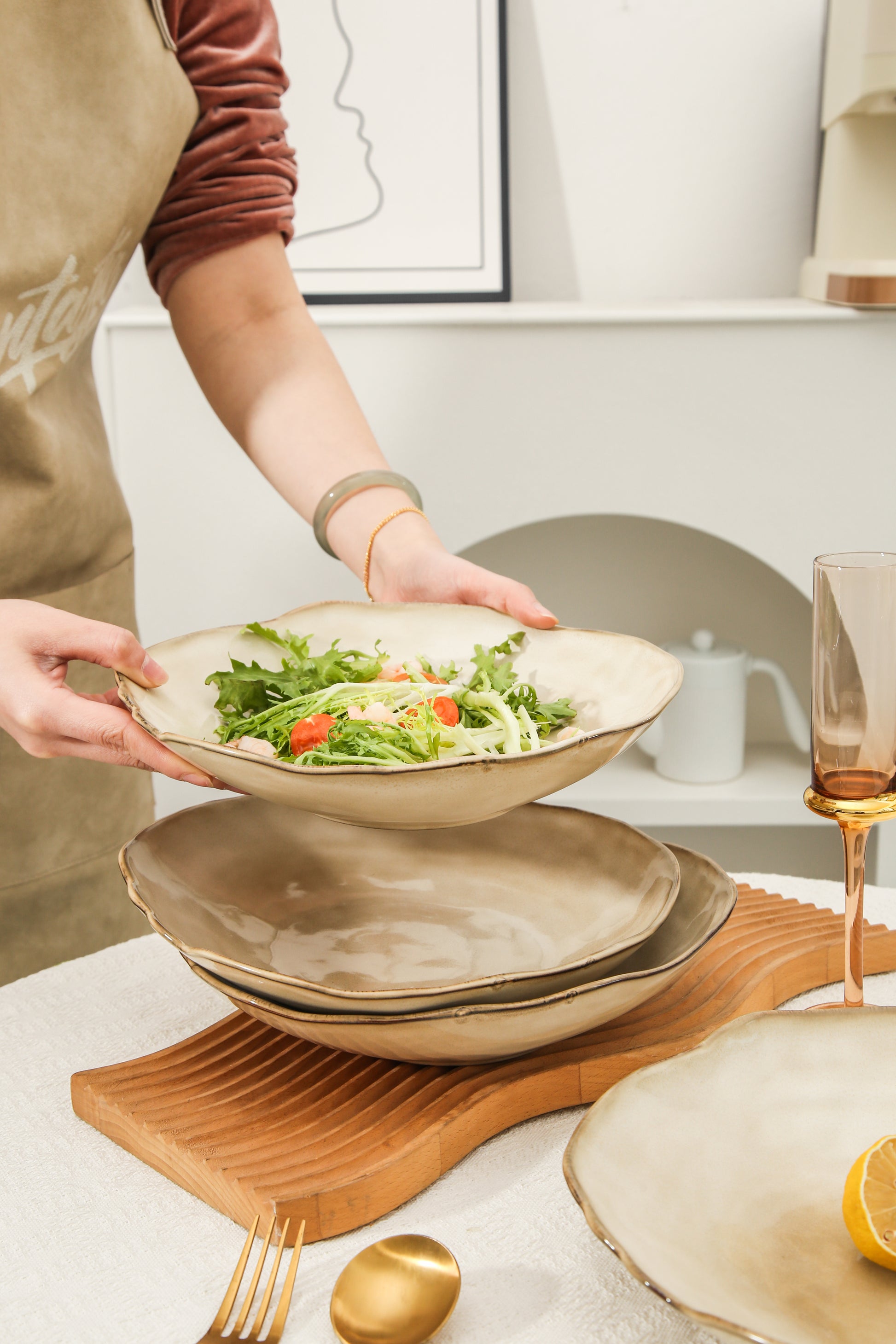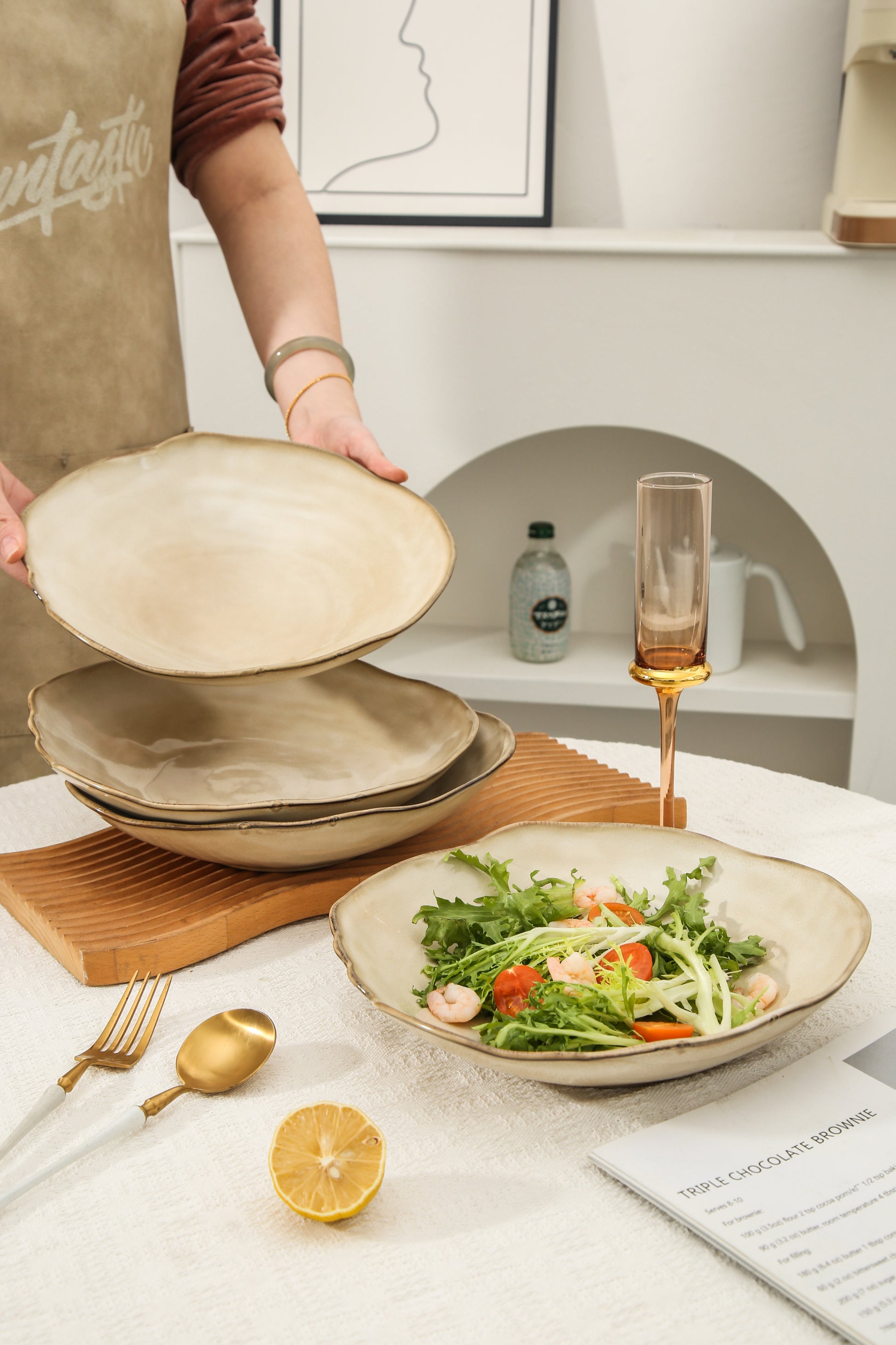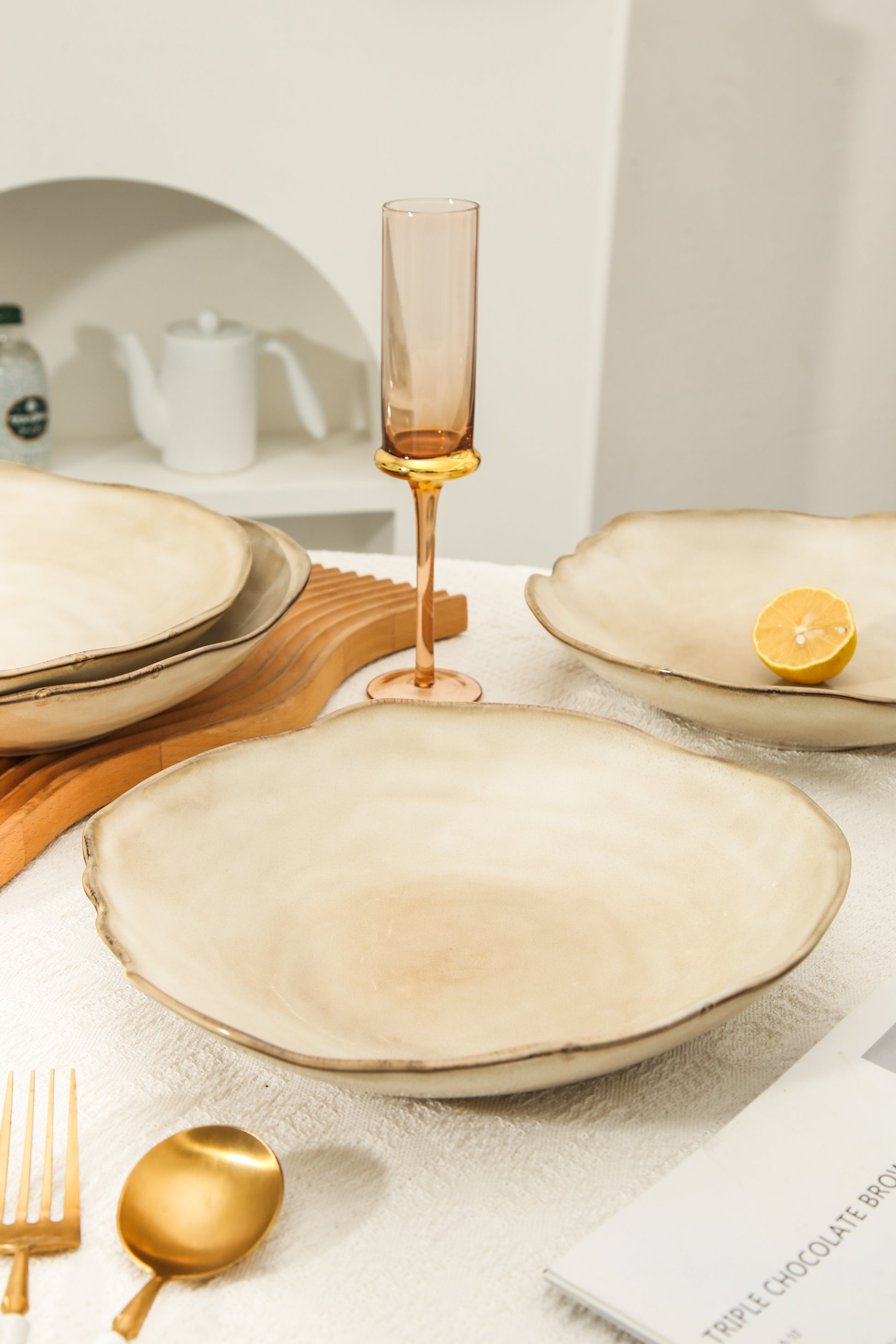 The Crema deep plates feature gentle, uneven rims that feel like they were formed by hand—because they were. Their organic design gives them an approachable, artisan feel while still delivering the durability needed for everyday use. With a soft glaze and naturally contoured profile, they serve beautifully and stand up to daily wear.