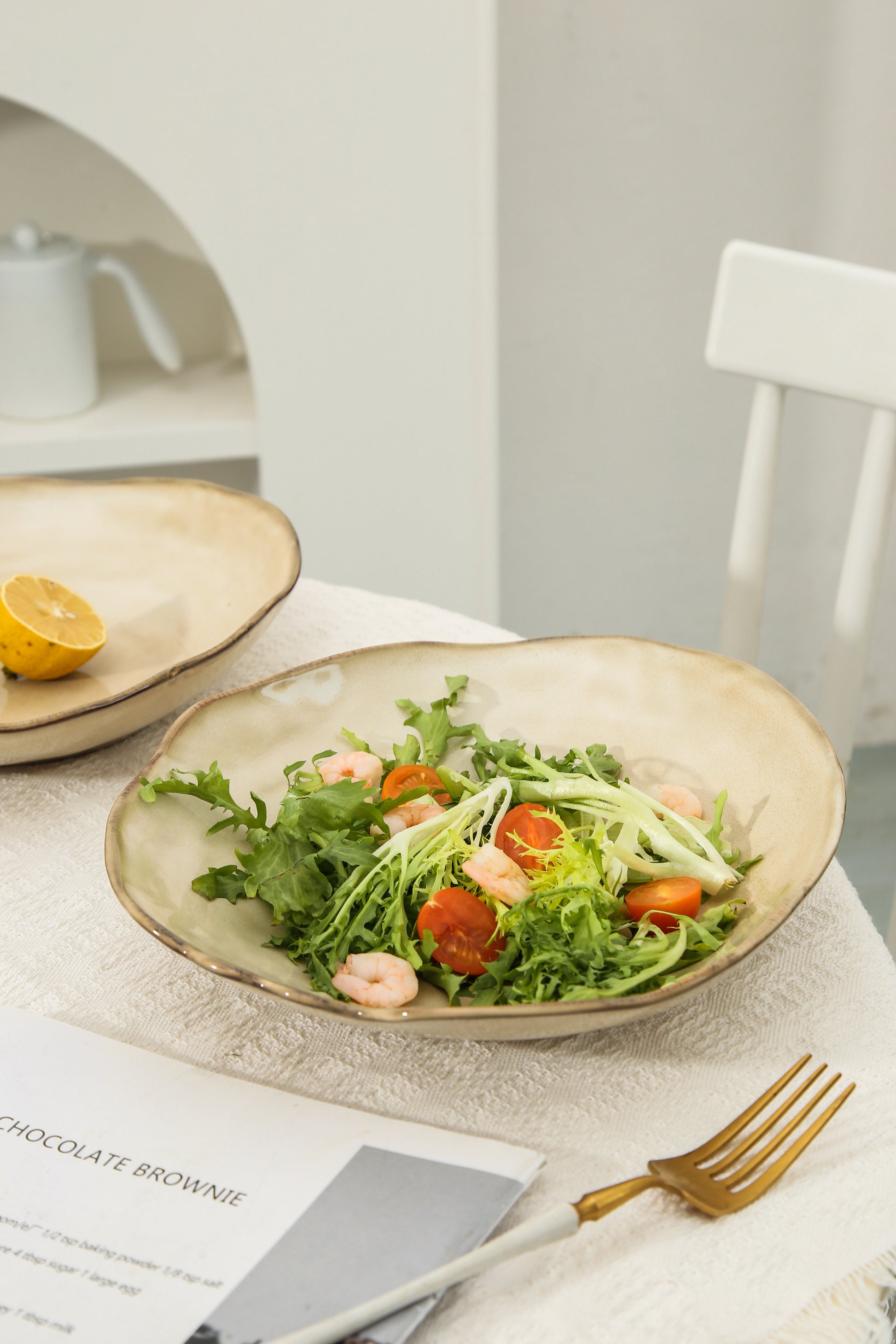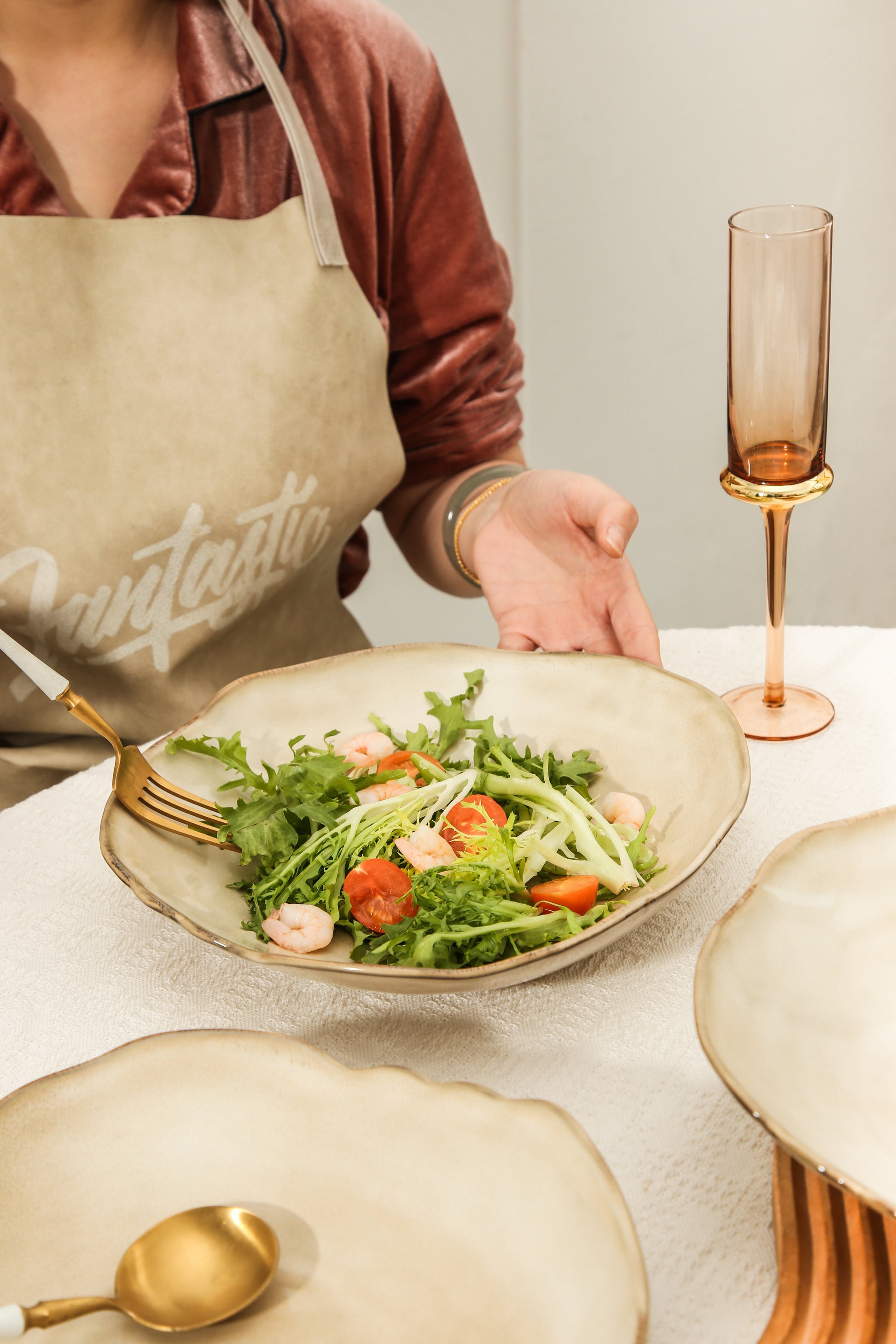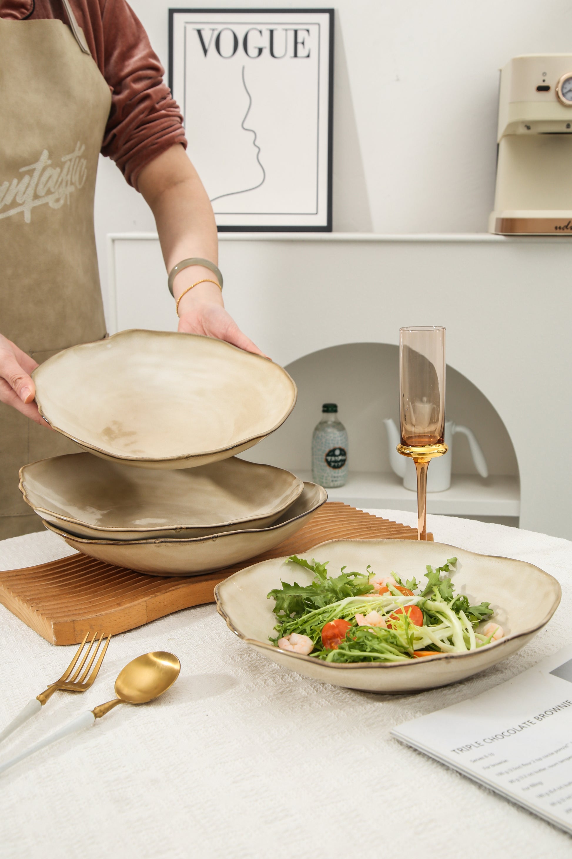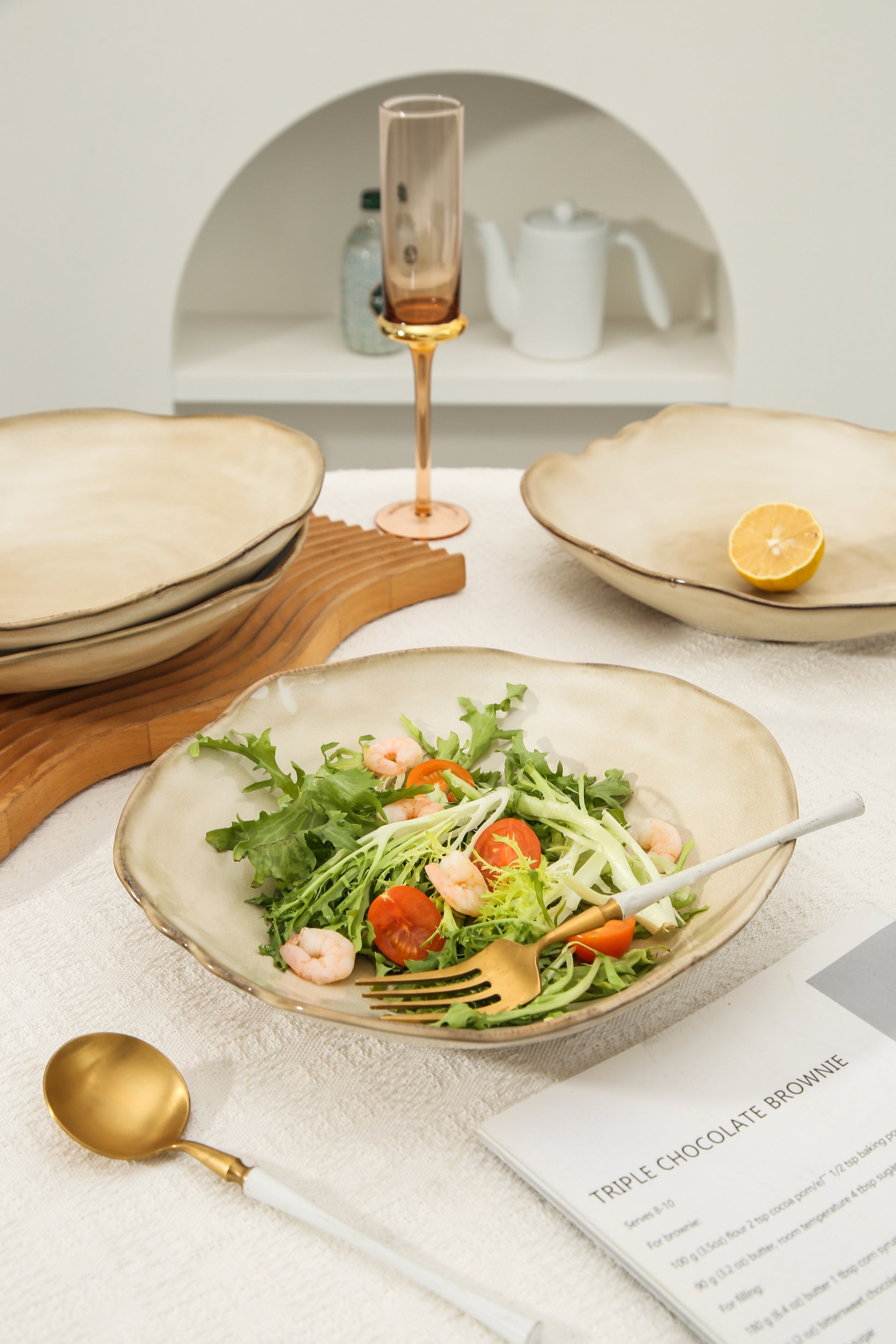 The Crema deep plates feature gentle, uneven rims that feel like they were formed by hand—because they were. Their organic design gives them an approachable, artisan feel while still delivering the durability needed for everyday use. With a soft glaze and naturally contoured profile, they serve beautifully and stand up to daily wear.