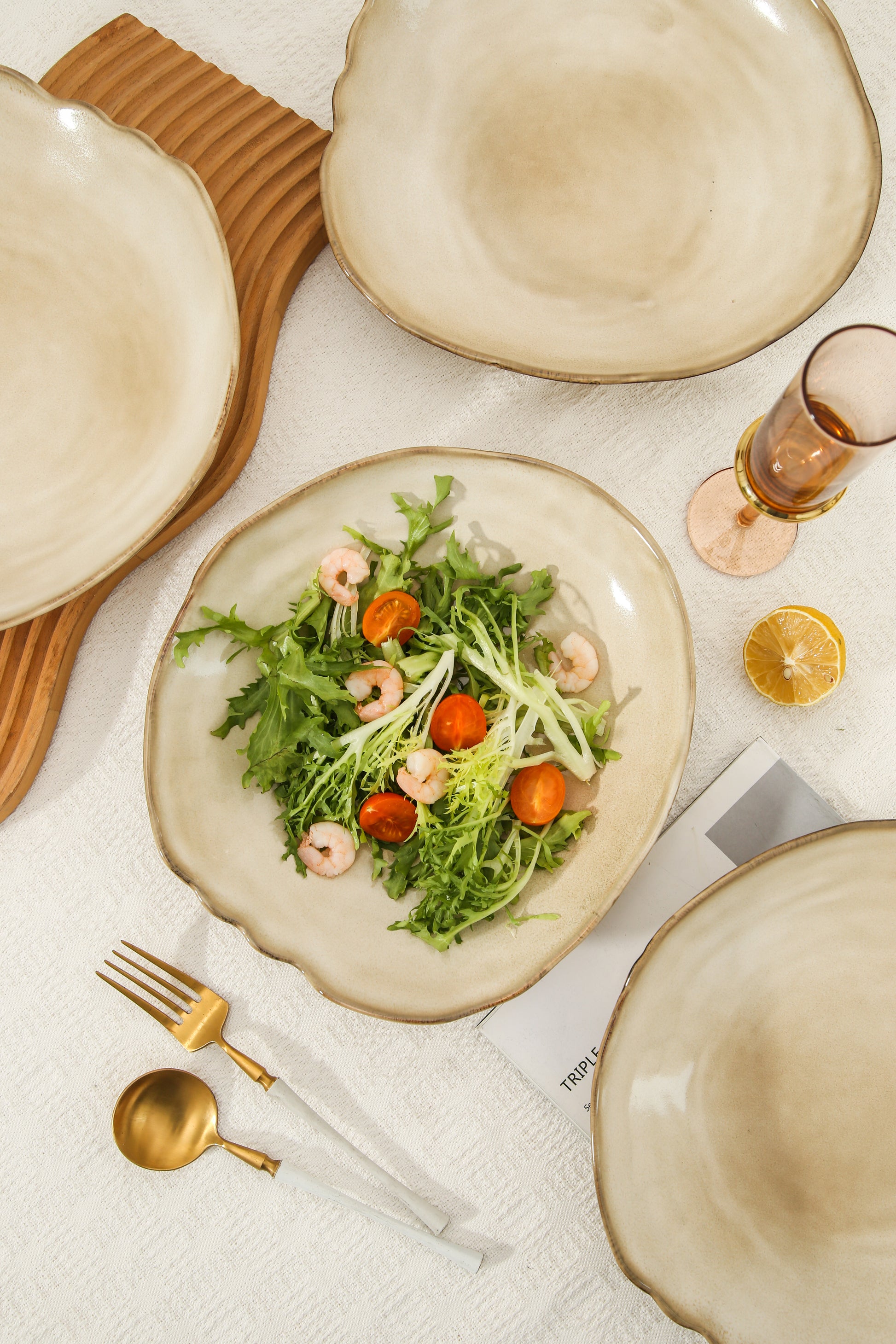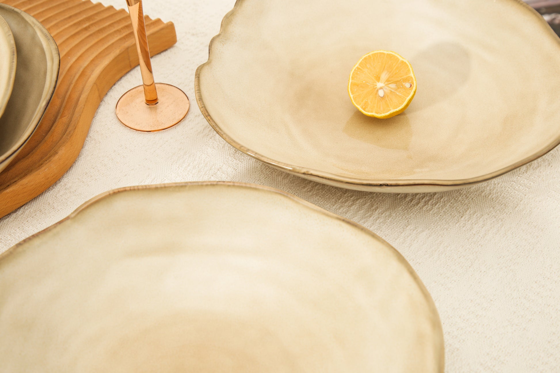 Each plate is molded from carefully refined stoneware clay and fired at high temperatures for added strength. As part of the Organic Collection, the shaping process emphasizes natural curves and fluid lines, not rigid molds. The hand-applied reactive glaze brings out the earthy tones of the clay, giving each piece subtle depth and character.