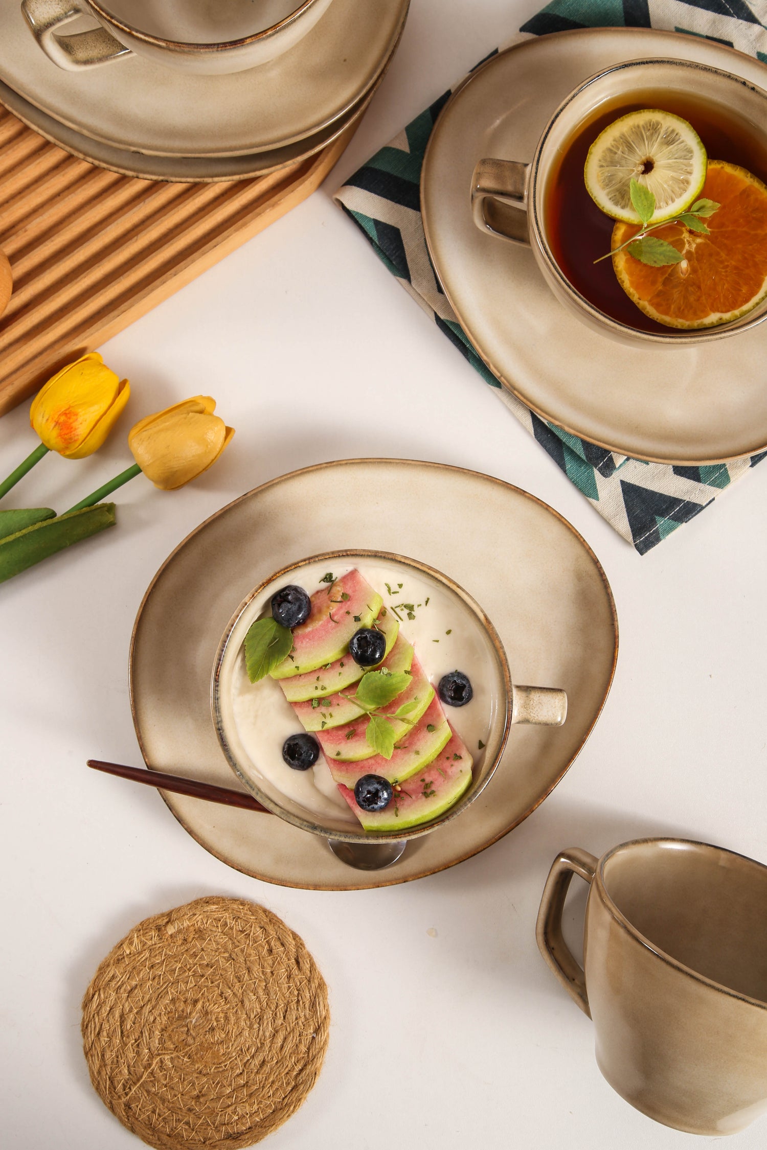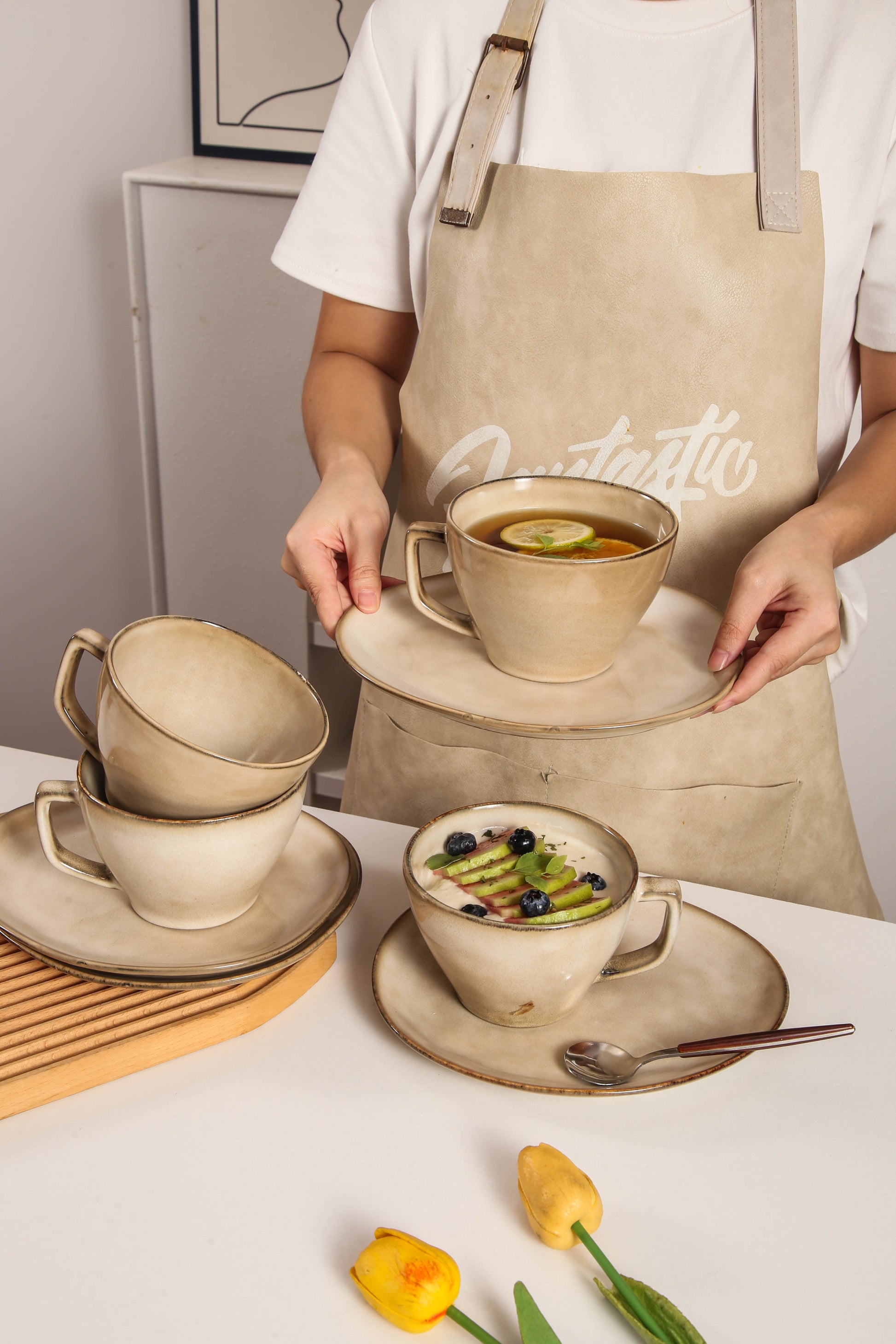 Hand-finished with a rich Crema reactive glaze, each cup and saucer is kiln-fired for durability and subtle color variations. The soft, sculptural design brings timeless elegance to your table while remaining practical for everyday use. Ergonomically shaped cups ensure comfort in every sip, making this 8-piece set perfect for daily enjoyment or as a thoughtful gift.
