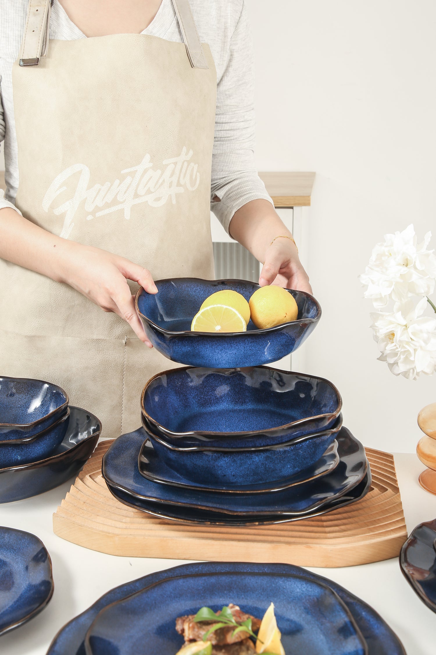 Each Decosignature dinnerware set in Ocean Blue is made using premium stoneware clay, carefully shaped and fired at high temperatures for strength and durability. A reactive glaze is applied to enhance the natural characteristics of the clay, creating subtle variations in color and finish. This process ensures every piece has a distinct look, combining quality with the rich tones of Ocean Blue.